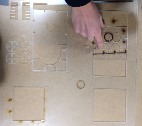 I made the design of the pieces with Inkscape, export them as DXF files, and finally I import then into LaserCut 5.3 to send then to the Laser machine. In the end I have this