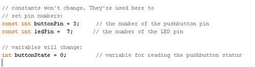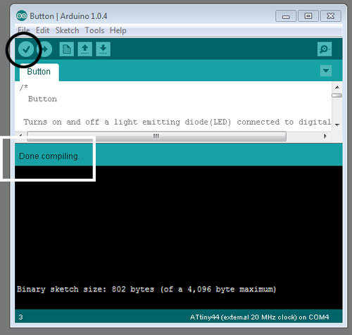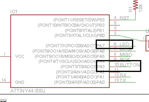 After open the Button sketch from the examples menu File > Examples > Digital > Button. I have change the pin numbers from the LED and the button because the pinouts on the ATtiny 44A microcontroller are not the same numbers that in the Arduino code.