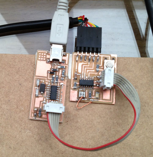 Connect the 6-pin programming header in the FabISP and the LED-Button board with a cable