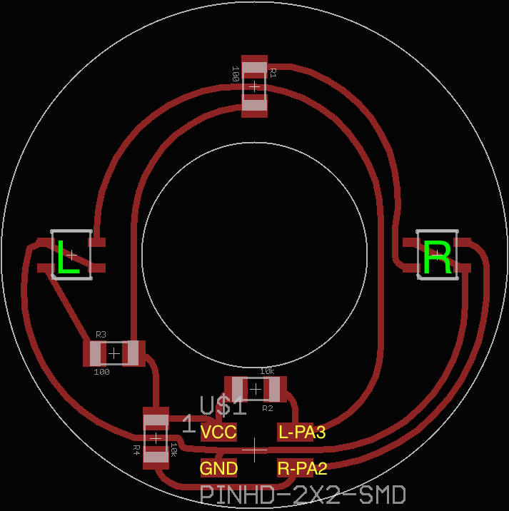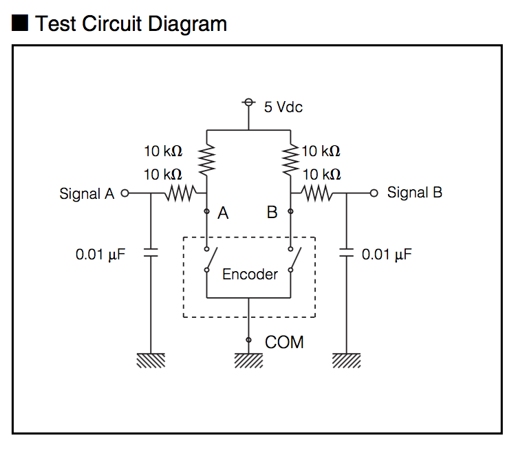 Primary criteria in chosing the encoder for my project was price. The complete Zmeika puzzle ultimately consists of 24 or 36 joints - this is the amount of position sensing devices that contribute to the overall project cost. This panasonic P12335-ND encoder is priced just under 70c per piece and provides 24 pulses per rotation. Paired with the debounce circuit provided in the datasheet, hooking it up to the ATtiny was a breeze. By the time I was working on this part, I already had no access to the Modela mill, so the filter networks of 4 resistors and 2 capacitors were built from through-hole components and soldered directly to the encoders.