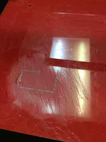 The Modela machine needed a tiny bit of maintenance before I could get started with my assignment. Previous user left quite a burr in the sacrificial board, together with a piece of a mill stuck inside. It took a quarter of an hour of cleanup and sanding to get to a satisfactory flat surface to which I could double-tape the copper-clad board.