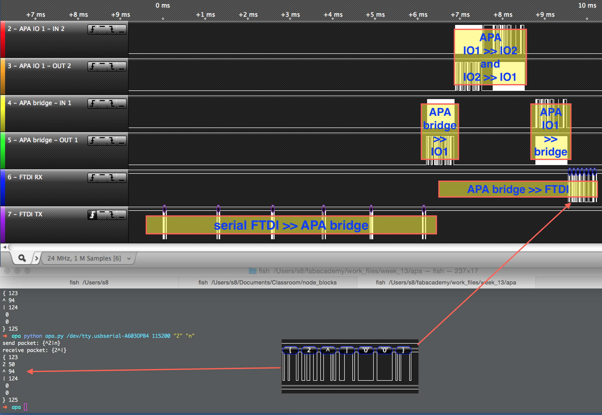 Logic analyzer was VERY HELPFUL in understanding the APA protocol and troubleshooting communication. Here are the photo of the APA network setup with analyzer probes attached, and the screenshots of the terminal and the analyzer window. Every stage of communication is clearly visible.