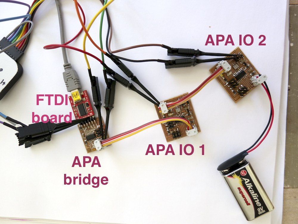 This week we were expected to make two or more microcontrollers talk to each other. As a departure point I decided to use Neil's Asynchronous Packet Automata protocol. APA intrigued me first of all because it's an extremely minimalistic protocol, whole functionality of which is contained within 700 lines of code. Secondly - it seemed like a good fit for my final project, as the network topology of my final project is defined by it's physical construction.