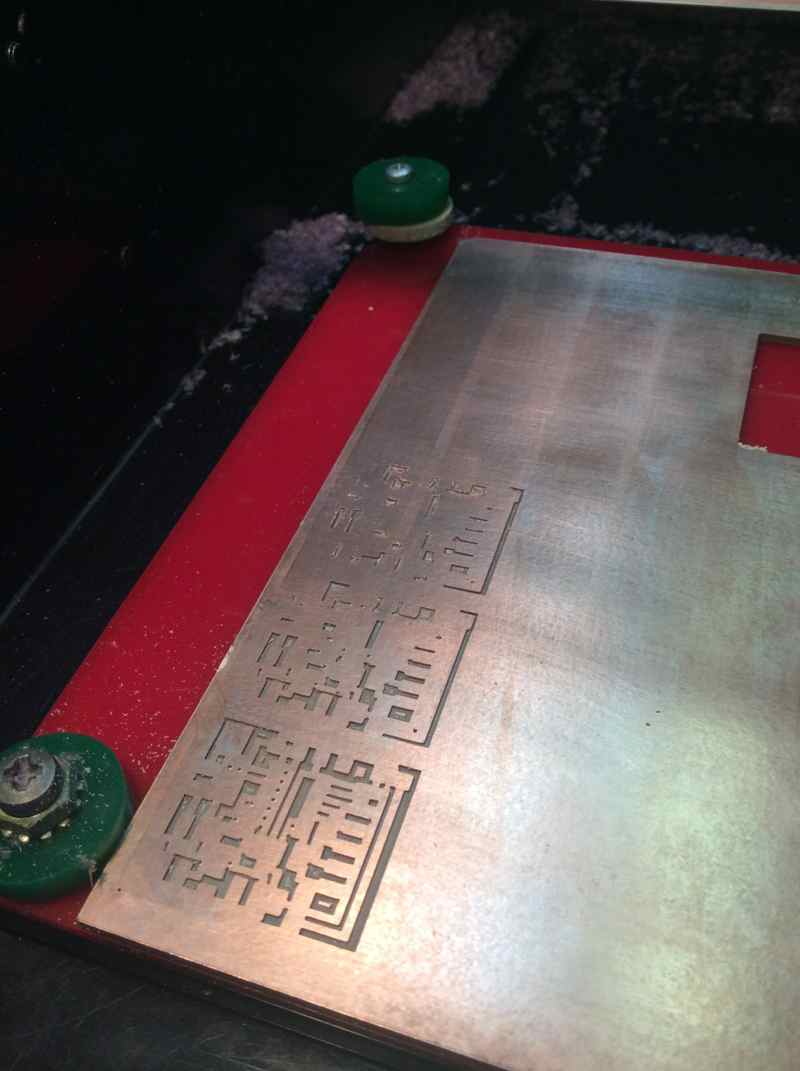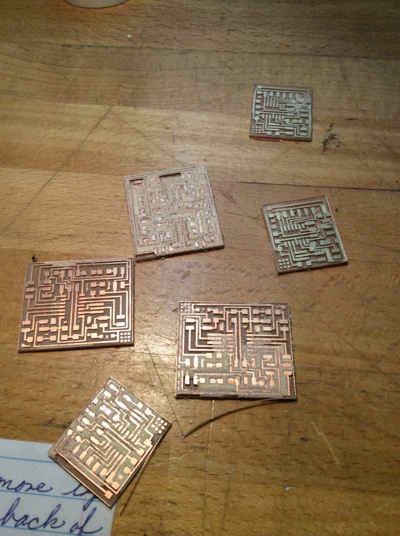 In an attempt to minimize travelling time between Brooklyn (home) and Boston (lab) I decided to mill a bunch of APA boards in one go and stuff and program them later. Loading a single batch of six boards seemed like a good idea until I discovered that Modela's table was level enough for a single board, but wasn't quite perfect for six of them.