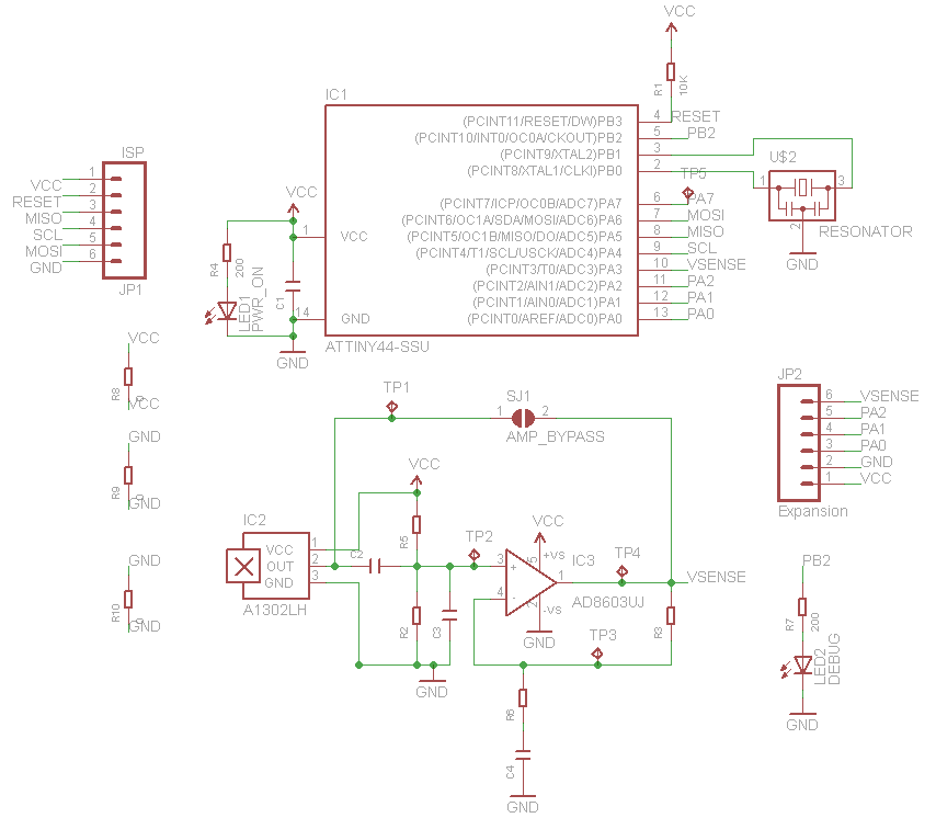 To see if it was viable to use the hall effect sensor in the way that I was thinking I created a new board in eagle. The board has the hall effect sensor and a place to put an op amp with a fairly general array of 0805 footprints to put passives to control the amplification. It is set up as an non-inverting amplifier with the ability to AC couple and bias the input, and have only amplifity AC or put a 0 ohm resisor in the place of C4 and amplify the whole signal. It might be nice to put another resistor in parallel to C4 to add a bit more flexibility to the topology. Hopefully I will get to construct the board soon and see how feasabily it is to pull such a small signal off the top of the bias voltage.