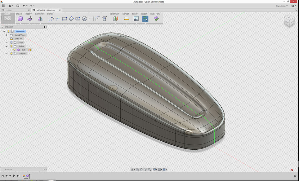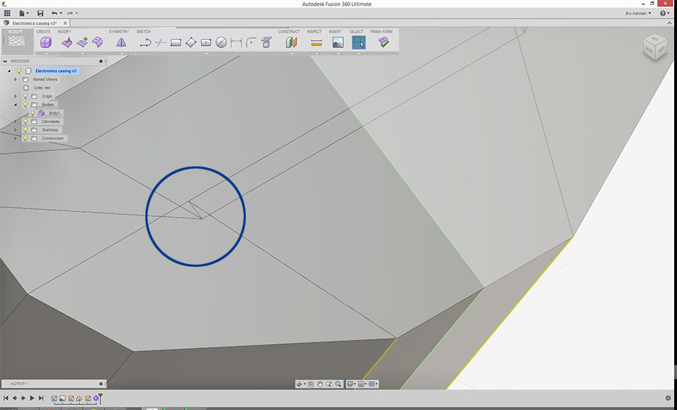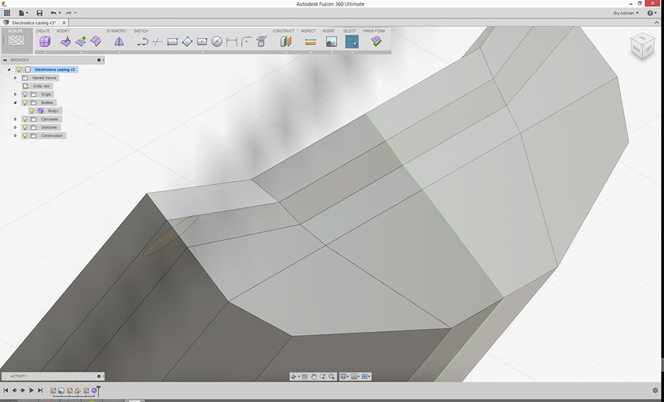 This was my first time using the form tools. They are a very different way of working than the parametric sketch and solid based workflow I normally used. The main challenge appears to be keeping the geometry valid for use with tools like thicken and shell later on in the pipeline. The most helpful thing that I learned for dealing with this was show the Box view which you can switch to quickly using `Alt+1` on windows. It is very easy to spot invalid geometry in this mode and other weird aspects that are going to cause you an issue down the line. For example this 'bow tie' like feature below.