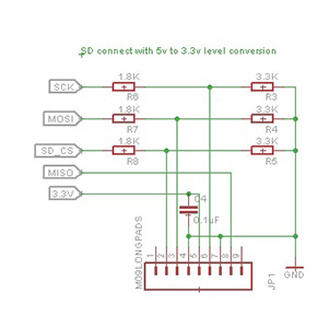 The issue from last week is that the SD card can’t run at 5v and the atmel chip can’t run above 4Mhz at 3.3v. So the first step was to add a level converter to drive the SD card at 3.3v and still allow the rest of the circuit to get to play at 5v. A voltage divider on each input line for SD should do the trick.