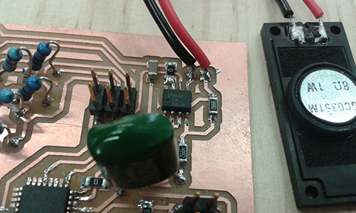 Following on from the input challenge this week we were tasked with adding an output to our board. I chose to continue experimenting with different audio circuits and added a speaker. I used an amp this time instead of the transistor-based setup I followed back in week six.