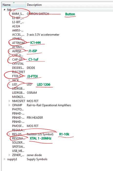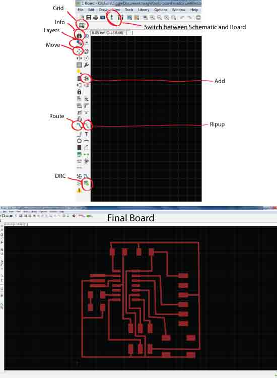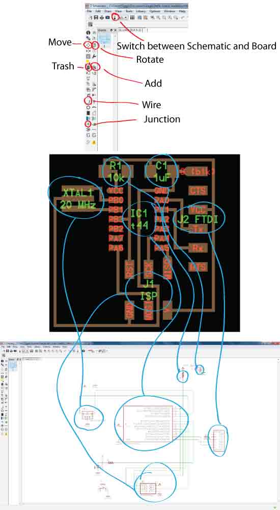 I created a special folder in documents for eagle. I opened it and then I created a new schematic board and saved it in the eagle folder. Then I went into libraries and I deselected them all but then chose supply1 library by changing the gray dot into a green dot. From the FabAcademy website I then found the fablib library - I downloaded it and I saved it in my eagle folder. Now I was ready to begin. I had a window open with an image of the board that I wanted to make - hello world board plus of course Eagle and my schematic board. I started adding all the pieces that are on the hello board into my schematic board. We used the red circled tools the most. I added the ground and the vcc just somewhere on the board and then I copied it and placed it at the right places. I connected everything together that is connected together on the hello board image with wire tool. In order to take away a placed wire I first chose the trash can and then the wire that I wanted to get a rid of. Here I had to be careful to place a junction where it was needed since on a schematic board the wires can go over each other.