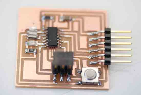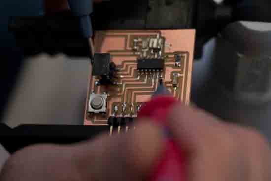 I put my folder on a chip and connected it to the computer since that computer has a hard time connecting to the fab serer. I put my file on the desktop and opened it from there in fab modules. I changed the cut depth to 0.2mm since we knew from before that by leaving it on 0.1mm it wastn´t milling all the way. Everything went really well and my board was ready not before long. I looked at my notes from week 4 beforehand so I felt quite comfortable.
