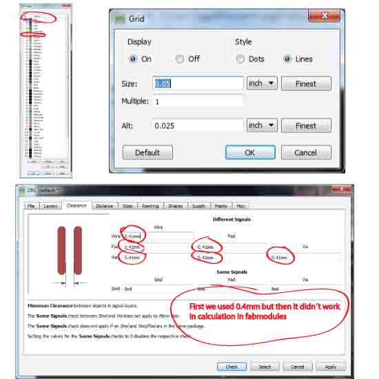 Now I used route in order to connect the yellow lines that showed me which pieces where supposed to connect. I was not paying attention when Bas said that the routes couldn´t cross so I was very quick but then I had to do everything over again with no cross overs. The grid helped a lot but it was also very helpful to go into info and use the number to move lines just a little bit. Once I was finished connecting everything I pressed DRC and opened clearance. There we put at first 0.4mm but then we had to change it to 0.41mm since we all had an error in fabmodules. Then I press check and the software gives me some errors that I slowly fix. The trick is to check every single time I make some changes untill I have no errors.