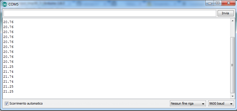 The upload went successfully and the board was recognized. It was time to test a first sketch for input exercise. For my exercises I used a potenziometer and an analog temperature sensor: tmp36