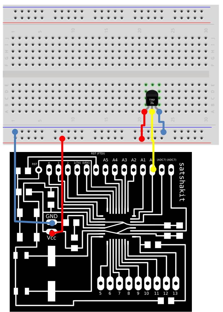 the circuit is similar to the previous one for potentiometer, by connecting the board with TMP36 by A0 pin