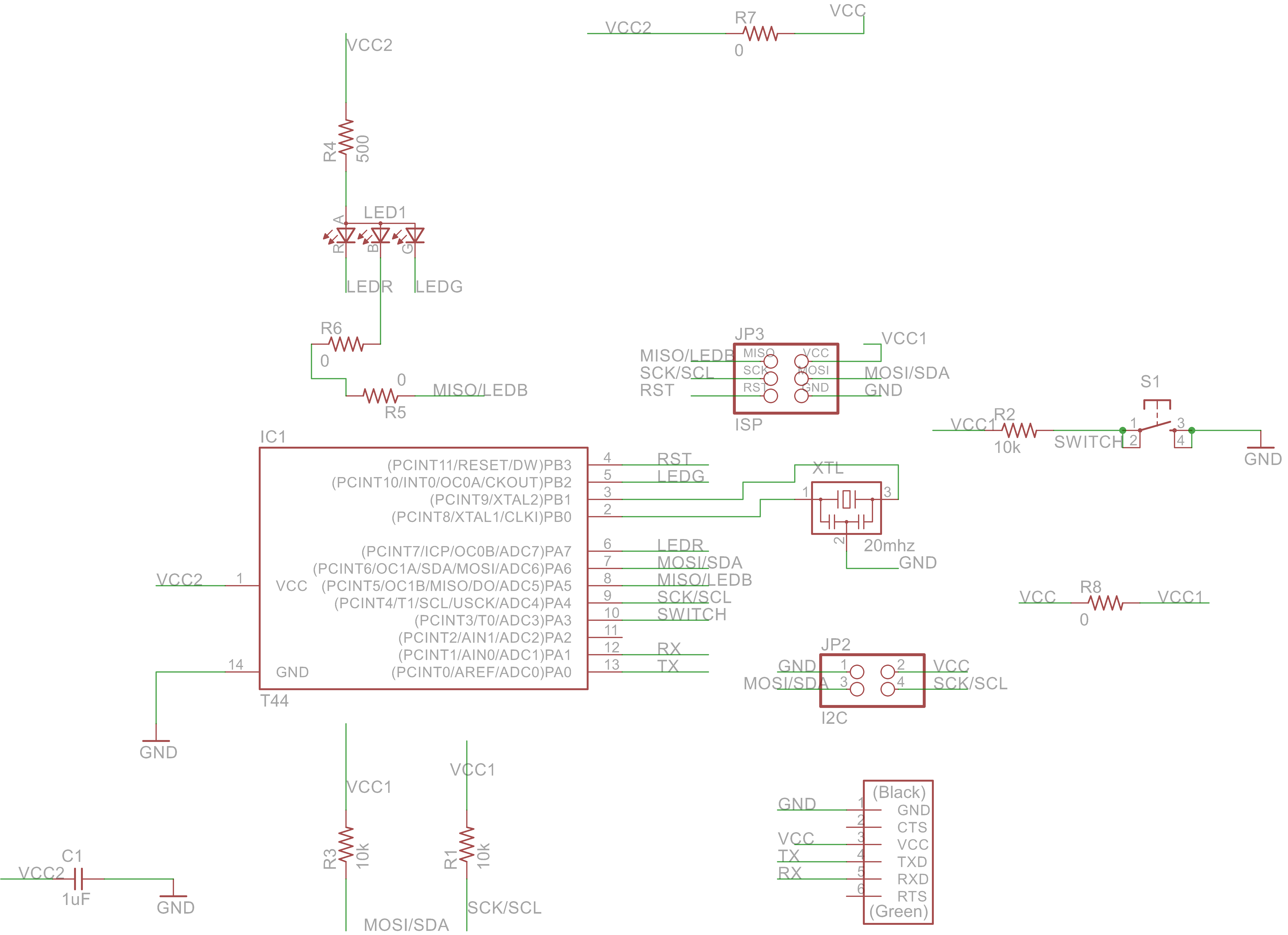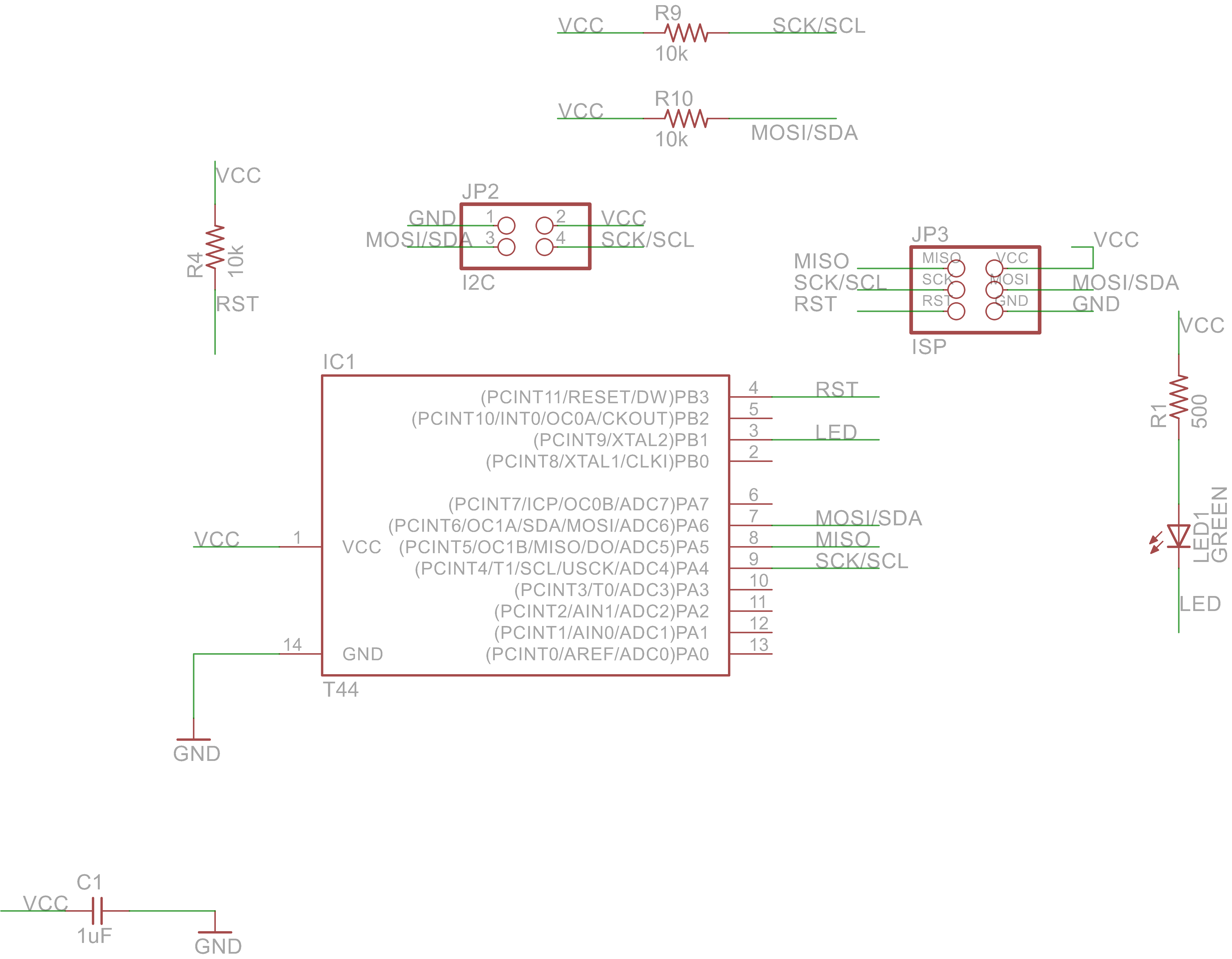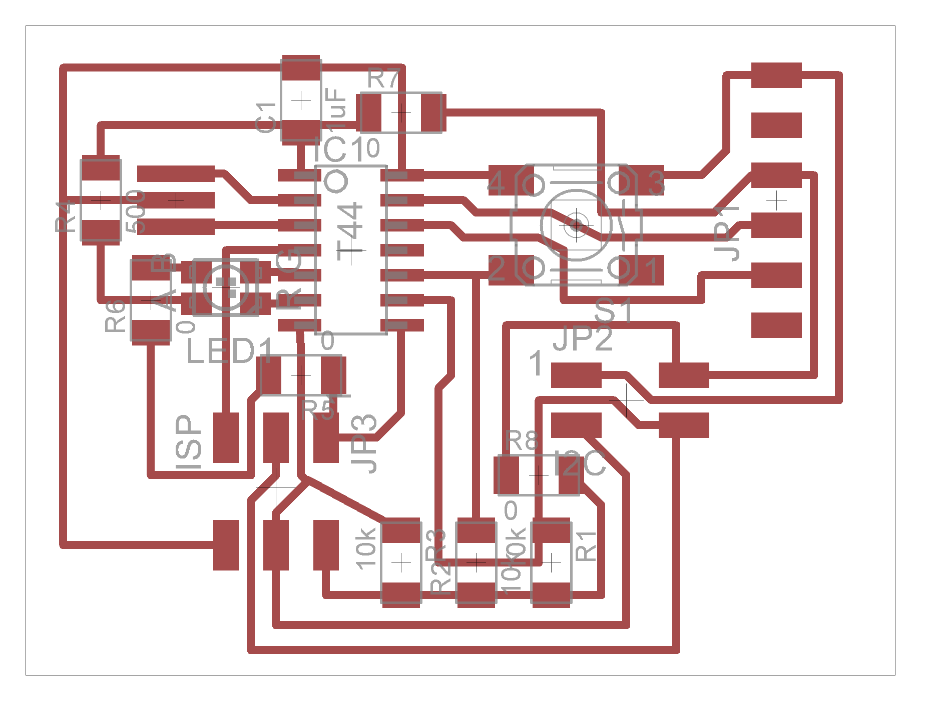 I wanted to use the ATtiny 44 in stead of the ATtiny 45, because it has more pins so you can make a more extended board with it. I've been using them in most of the other circuit boards I made in Fab Academy, so it seemed like a logical step to learn how to make these ICs communicate. I think I2C is a nice protocal to let them communicate, since it had a shared clock and can connect multiple slave/nodes with on only two wires.