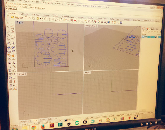 I was then able to import the cut file into Rhino where I had to edit the file and add drill points at every inner corner so that the pieces would easily slide all the way together. This isn't a perfect solution but it does take care of the fact that our cutting bit has a certain radius and can't cut all the way into corners. At this point the file was ready for the CNC Machine.