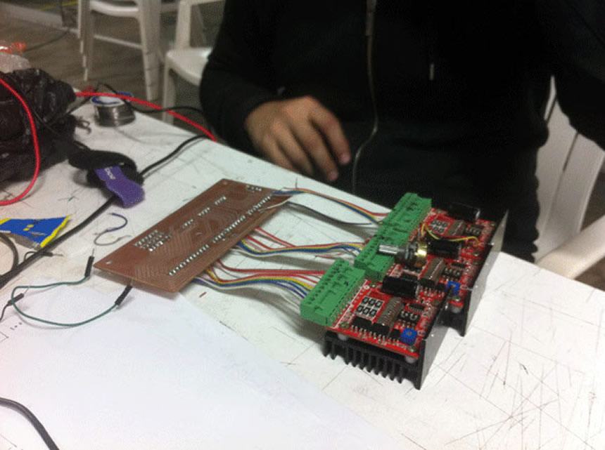 We're using an Arduino board loaded with GRBL firmware , this is connected to 3 TB6600 drivers,controlling our 3 NEMA23 motors. We designed and fabricated a distribution board,to make an easy and clean wiring. the power supply that we are using, is a ATX switching PC power supply (12v) for the drivers, the feeding for the arduino is via USB, and for the milling tool( that is a spindel 300w) we are using (by the moment) the lab power supply (30V)