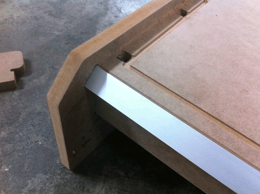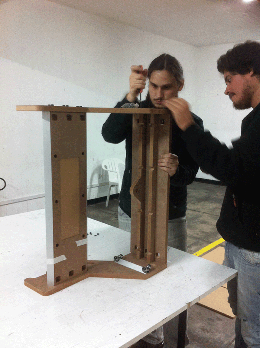 The assembly between mdf pieces has been ok. We had had problems assemmbling mdf pieces with aluminum extrusions(that are not perfect). This union had to be almost perfect because the aluminium profiles are the basis for the movement in the axis. Other problem has been the insert of other mechanical pieces for the movement. Finally we solved all issues as you can see below.