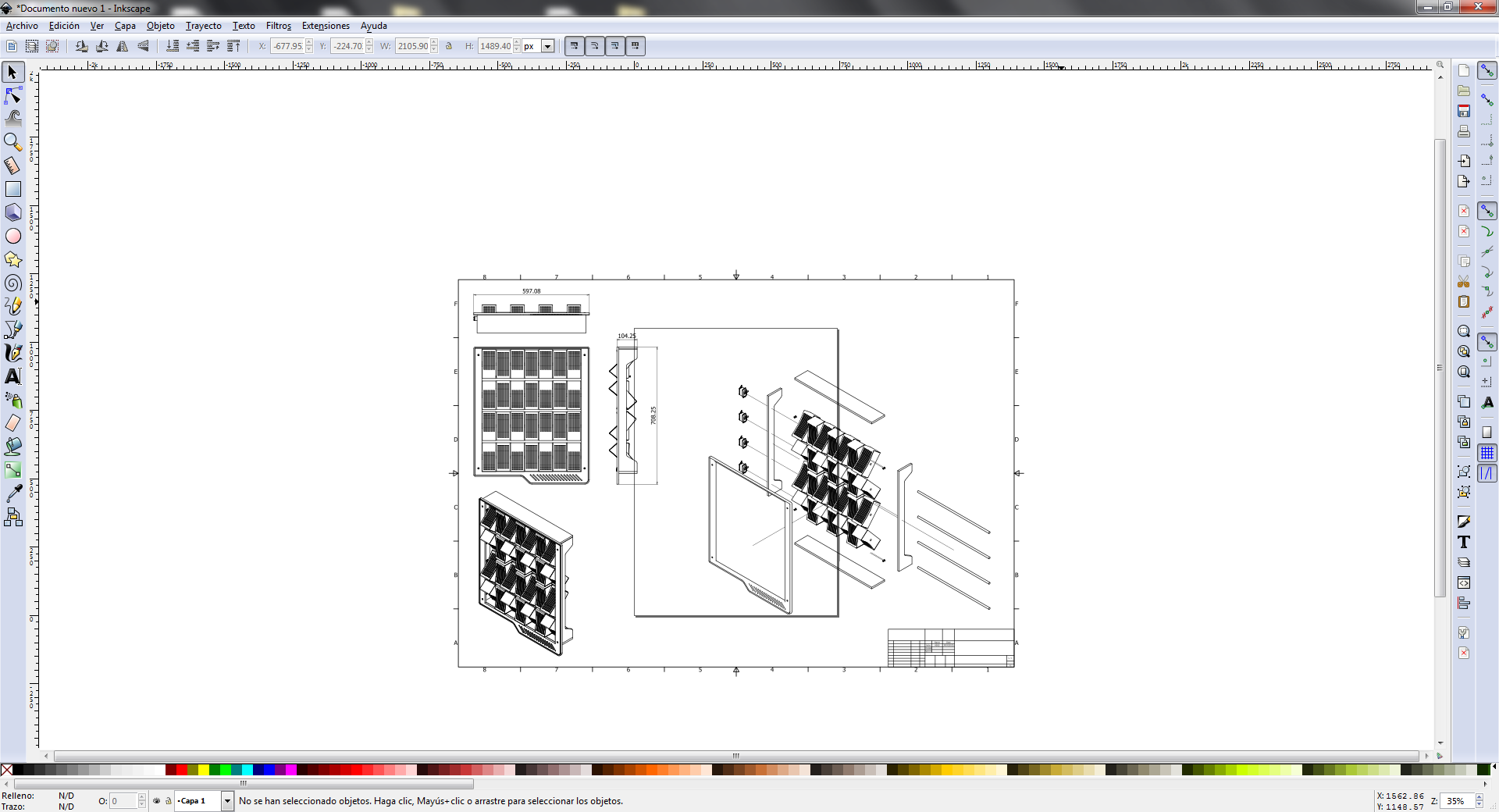 Then for transforming this 3D model to a visual representation y tried diferent ways, first with the inventor's built-in utility for blueprints i got some 2D diedric views and a exploded one, next i exported the file to PDF (save the lines like vectors), and opened in a vector editor software i tried Inkscape and Adobe Illustrator, First i tried illustrator and worked realy well, then i tried inkscape but it was runing realy teh file realy slow so i decided to keep working on illustrator, by using this program i had the posibility of editing the 2D views by simply moving the nodes and also to add color to the diferent views.