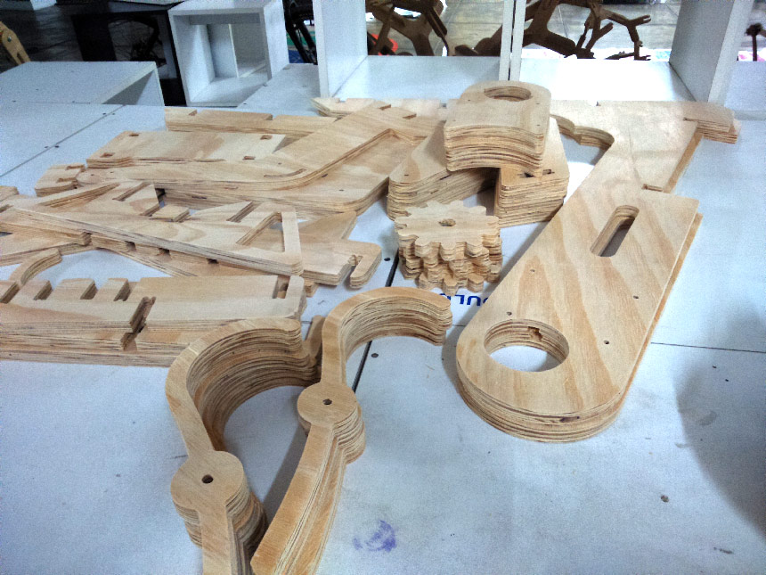 The structure is made of 15mm plywood, is a pressfit assambly with some bolted connections and bearings (608 2RS) on the moving parts the wheels are drived by two 24v geared DC motors (150 rpm), for the front pannel and for some details I used 3mm acrylic