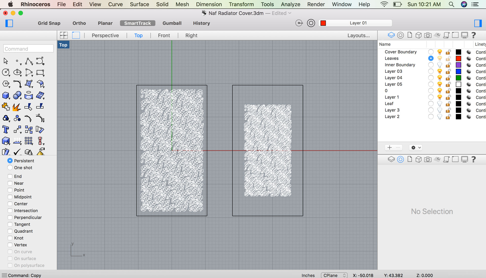 My first step was taking the pattern image and bringing it into Illustrator to edit it. I did an image trace to convert the image into a vector file and began to manipulate the components until I was happy with a base pattern. I will use this base pattern and replicate it. I then exported the file using a .DXF format so that I could use it in Rhino. Since the pattern will spread over a plywood sheet that is 21W x 39H, I needed to replicate it over a larger area. In Rhino I replicated the base pattern to cover the area.