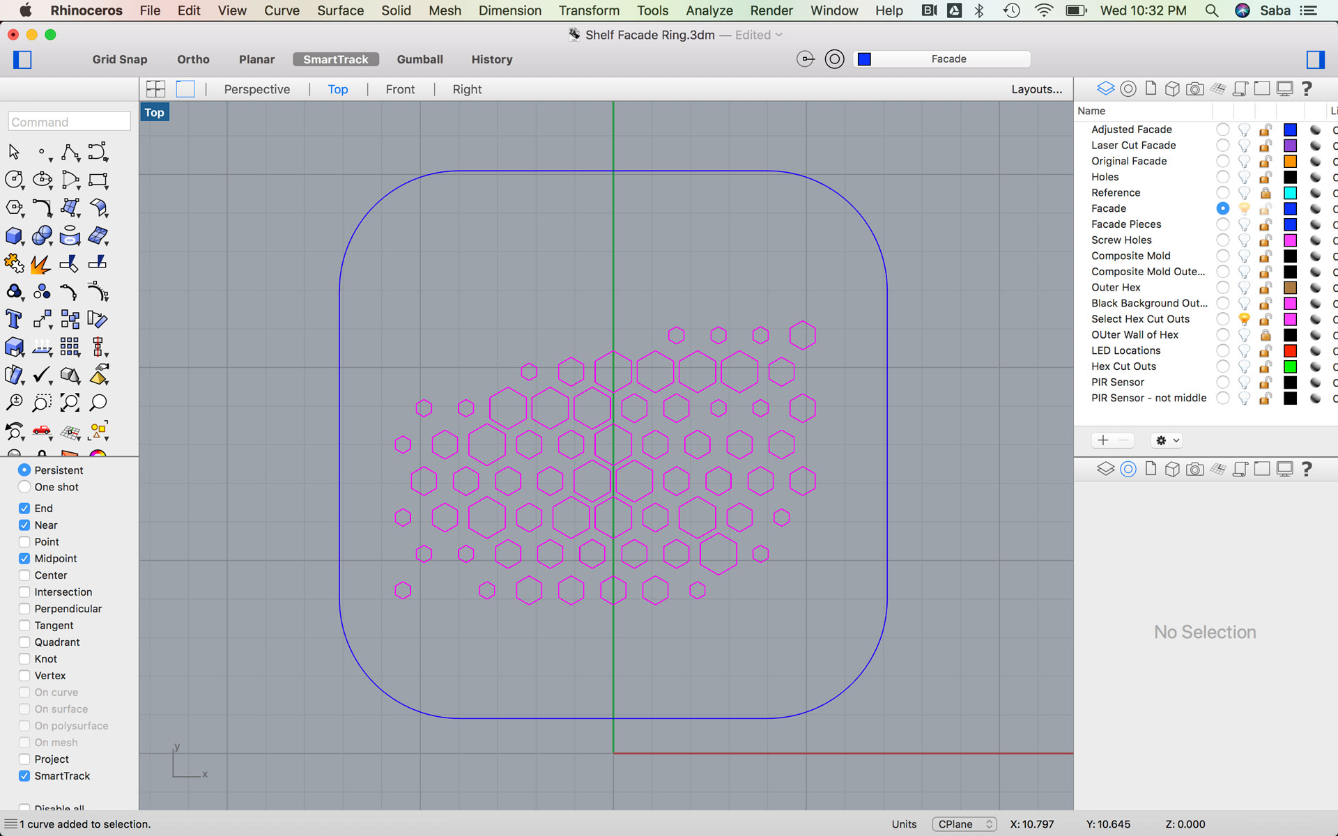 The diffuser essentially acts as translucent material to diffuse the LED Diodes that are integrated into the screen, so there won’t be strong hot spots. This will create a softer lighting effect. I created a mold in Rhino for the composite that will become the diffuser screen. The mold will create slightly concave indents in the composite diffuser where the LEDs will be located and allow the light to spread inside that area.