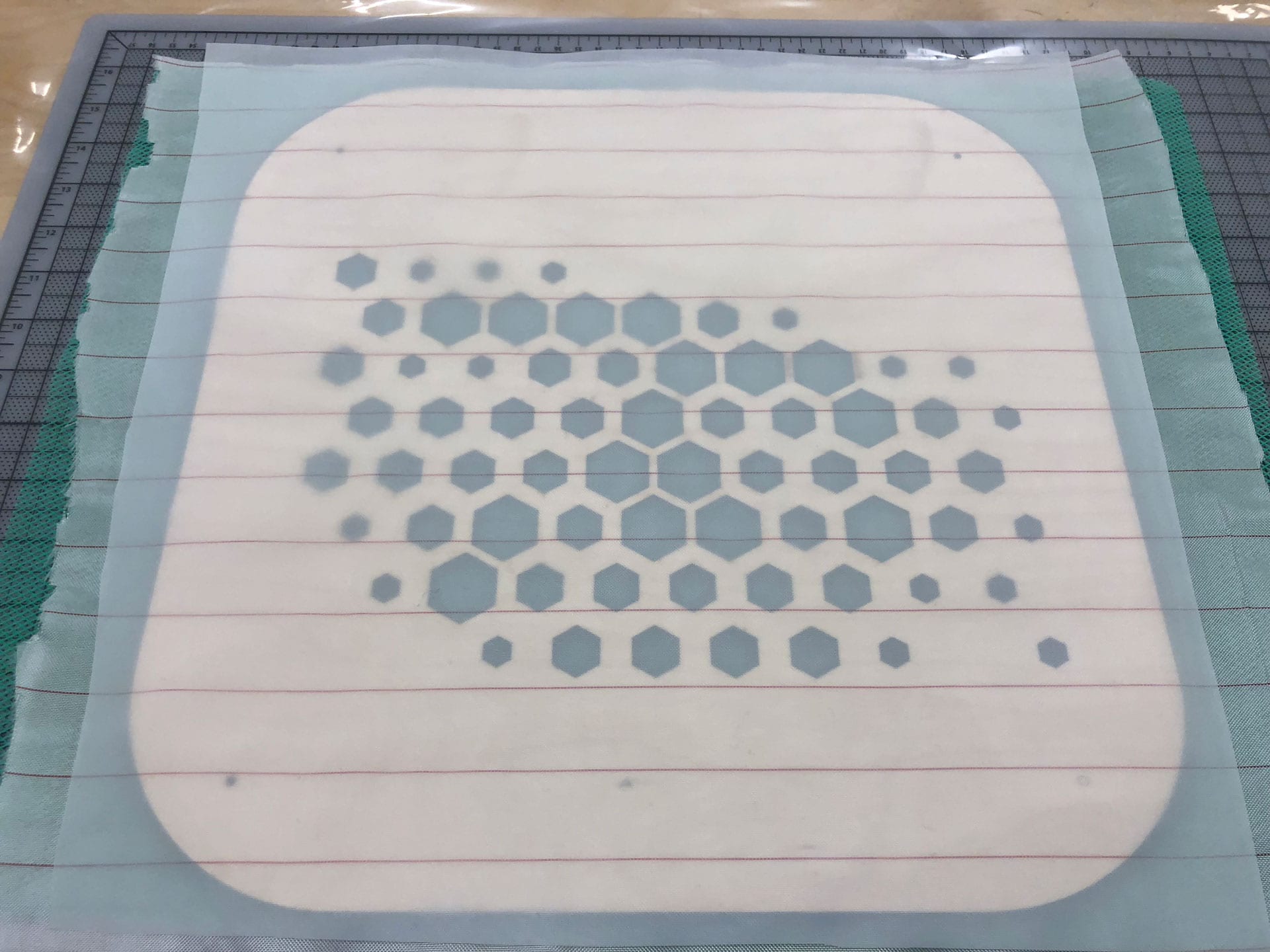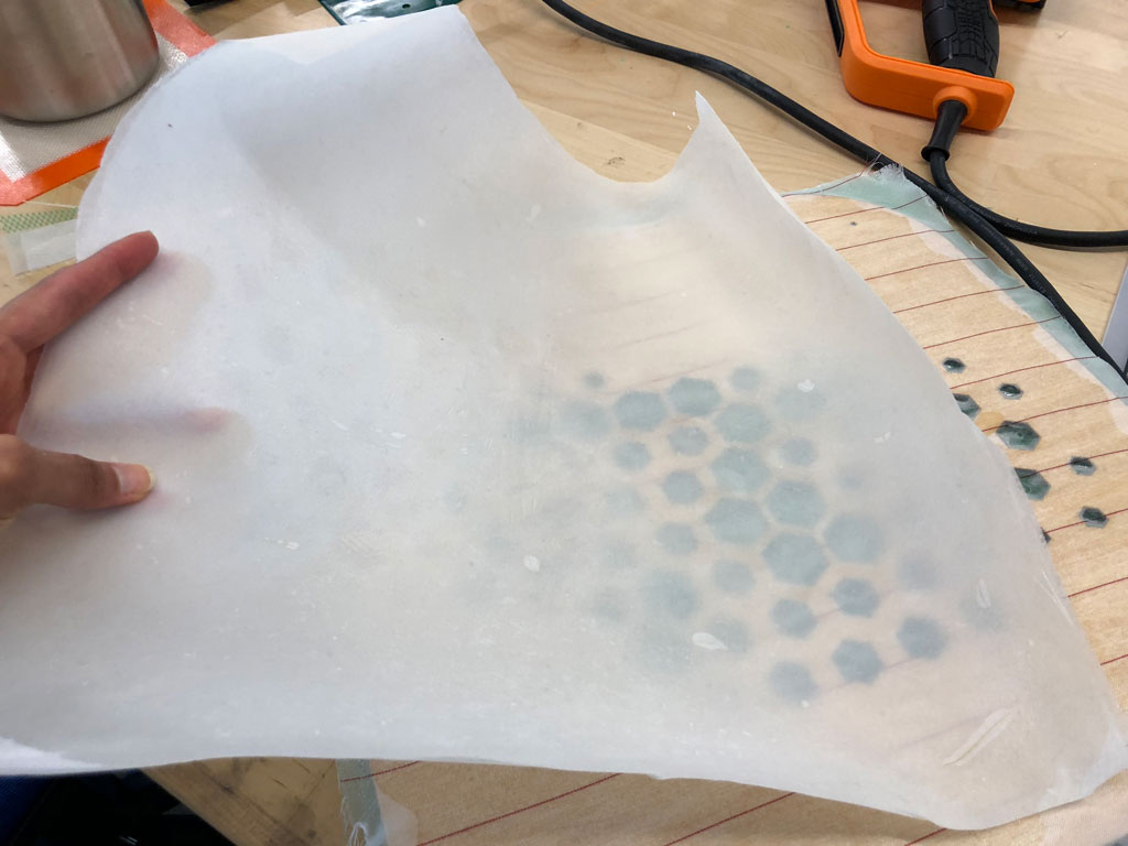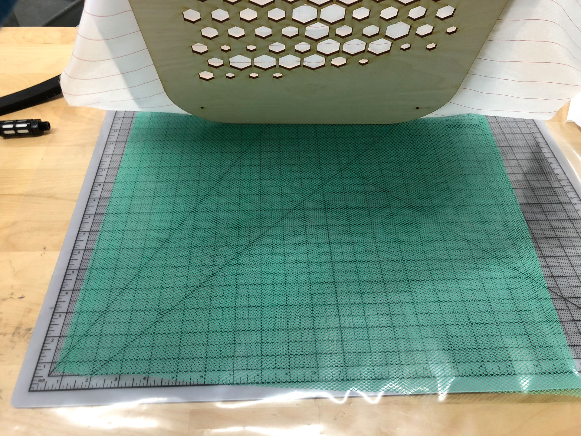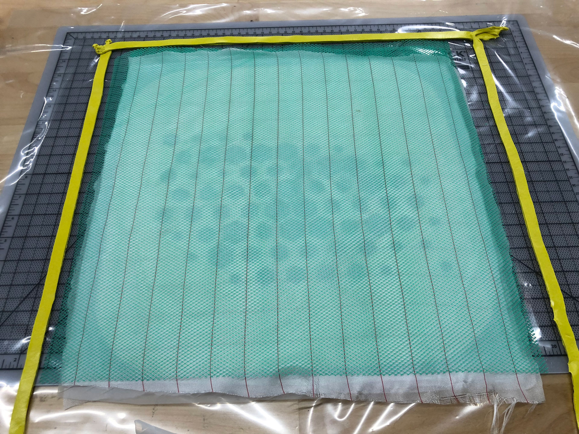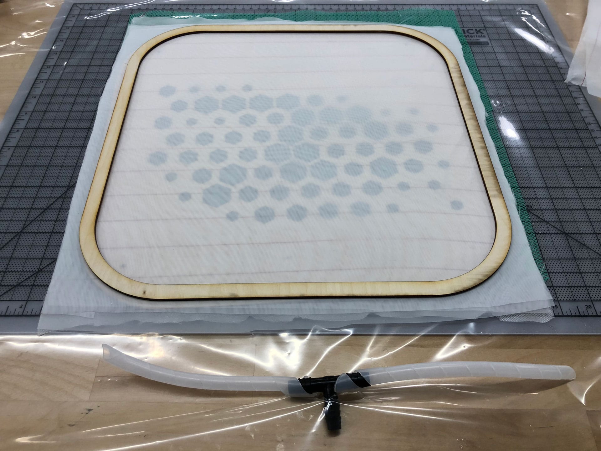 The final composite turned out really well. It took some effort to pry the composite off of the Peel ply, but it came off clean. The 3 layers of the mesh fabric in the composite created a translucent-milky white diffusion that should be just right for the LED lights that are integrated into my facade. I trimmed off the edges with a sharp exacto blade. Given the thinness of the mesh material, I was still able to bend it and it's soft enough that I can easily trim the edges with an Xacto blade. In the future, I'd like to experiment more with this composite mesh material. It seems ideal for creating curved forms that require some rigidity but can bend and take on different shapes. The composite is firm enough for my application and I plan to use this as part of the facade for Pixie.