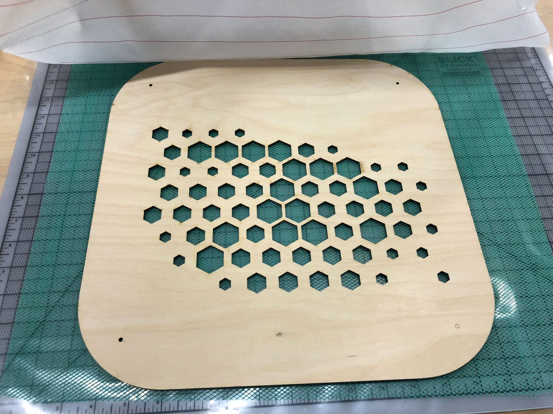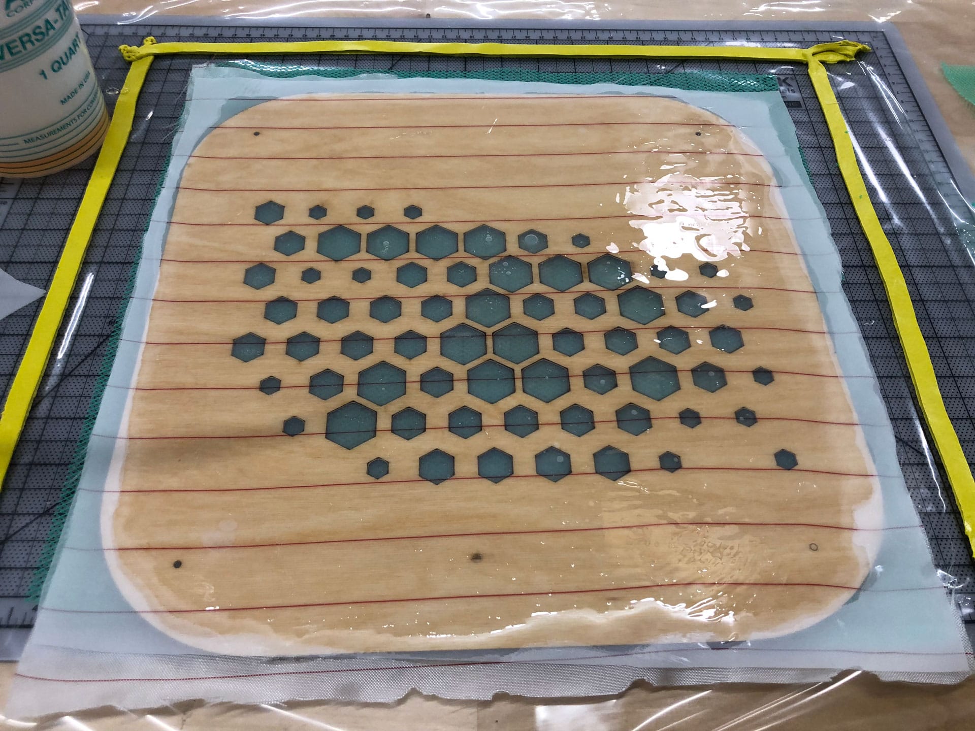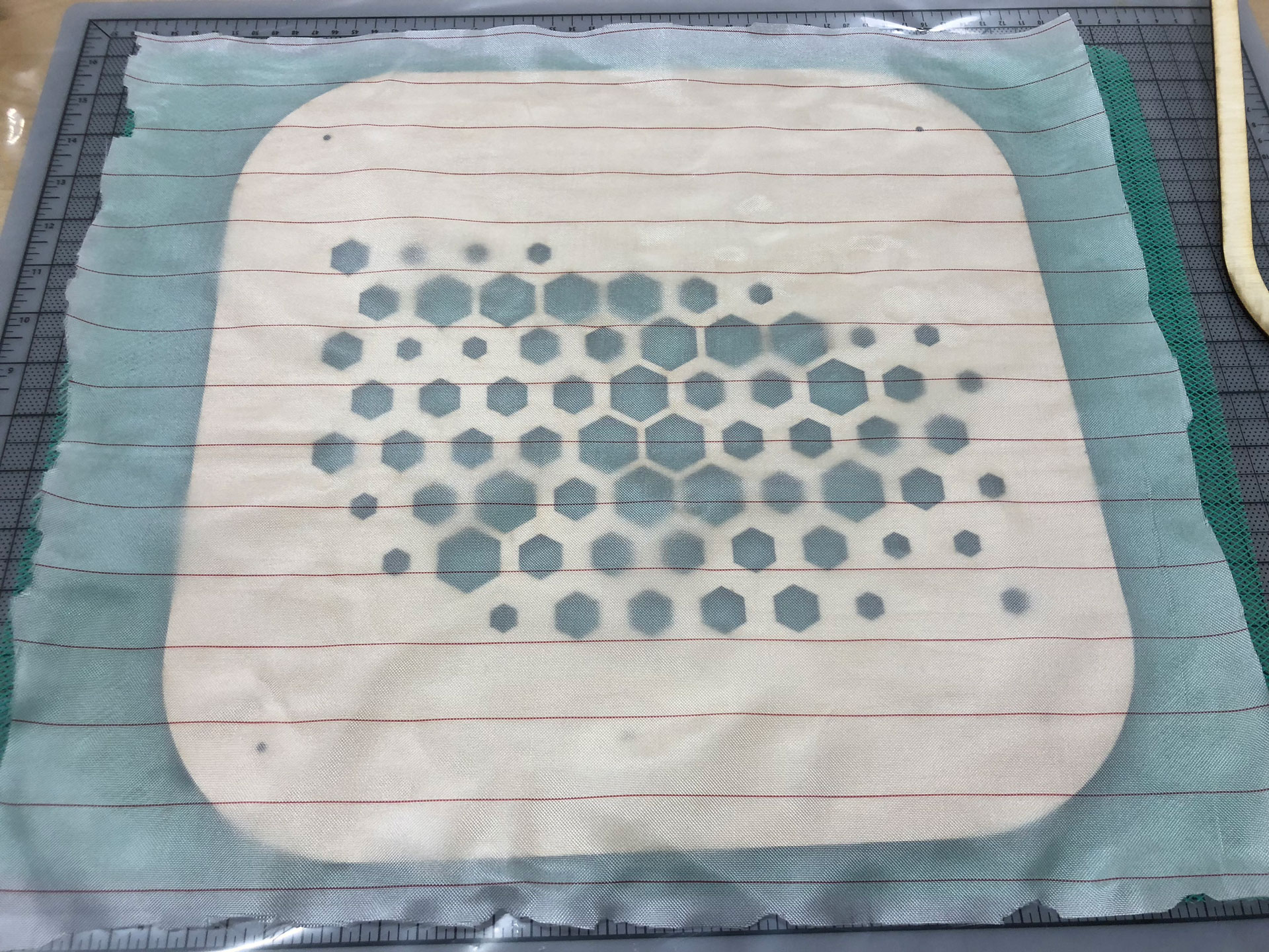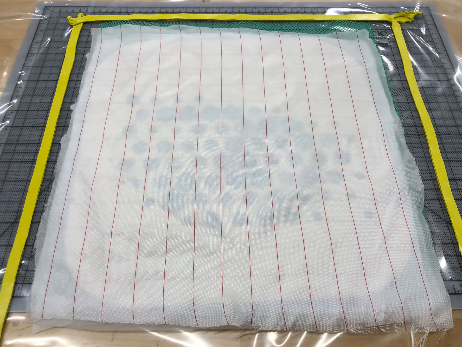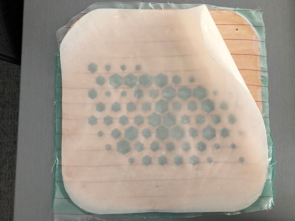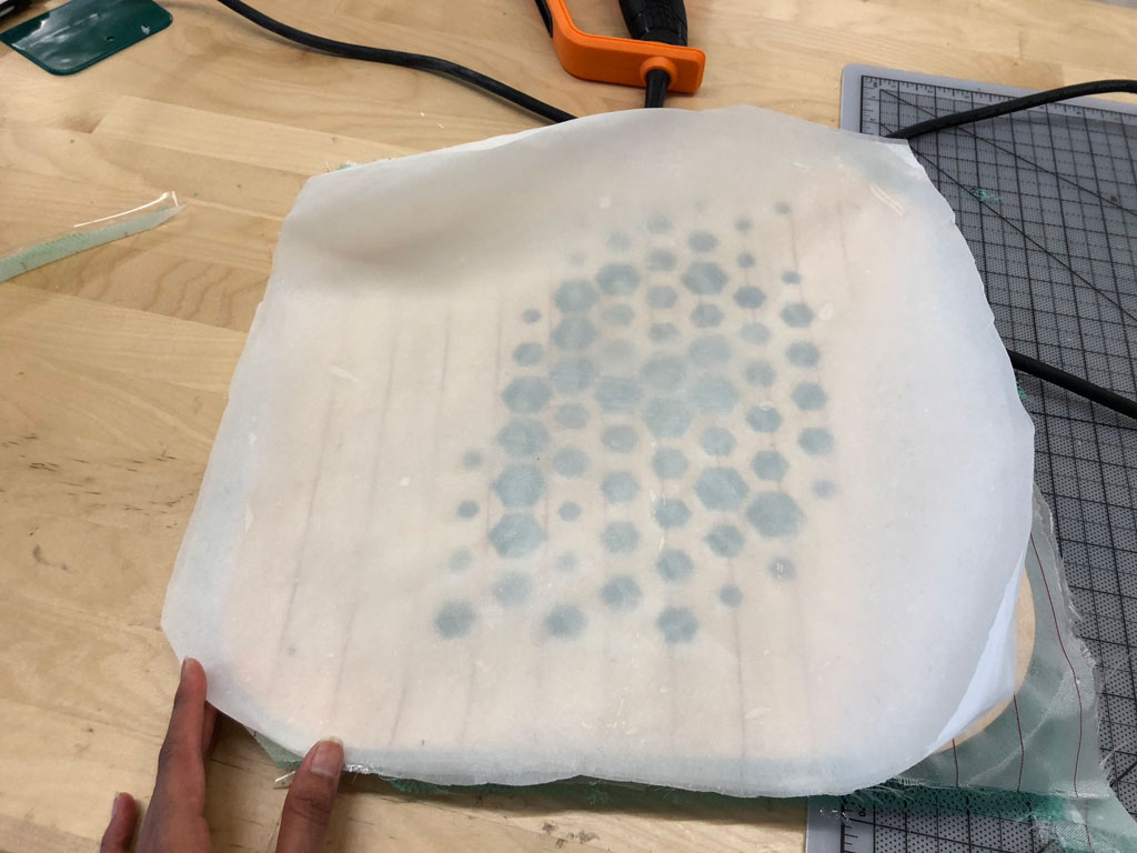 The final composite turned out really well. It took some effort to pry the composite off of the Peel ply, but it came off clean. The 3 layers of the mesh fabric in the composite created a translucent-milky white diffusion that should be just right for the LED lights that are integrated into my facade. I trimmed off the edges with a sharp exacto blade. Given the thinness of the mesh material, I was still able to bend it and it's soft enough that I can easily trim the edges with an Xacto blade. In the future, I'd like to experiment more with this composite mesh material. It seems ideal for creating curved forms that require some rigidity but can bend and take on different shapes. The composite is firm enough for my application and I plan to use this as part of the facade for Pixie.