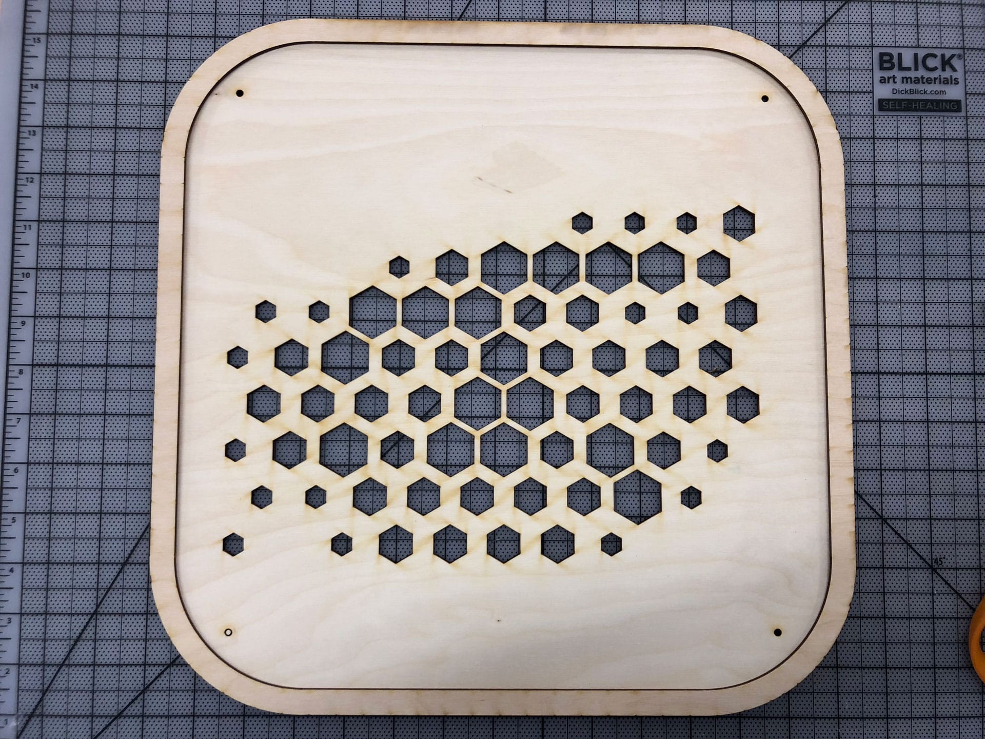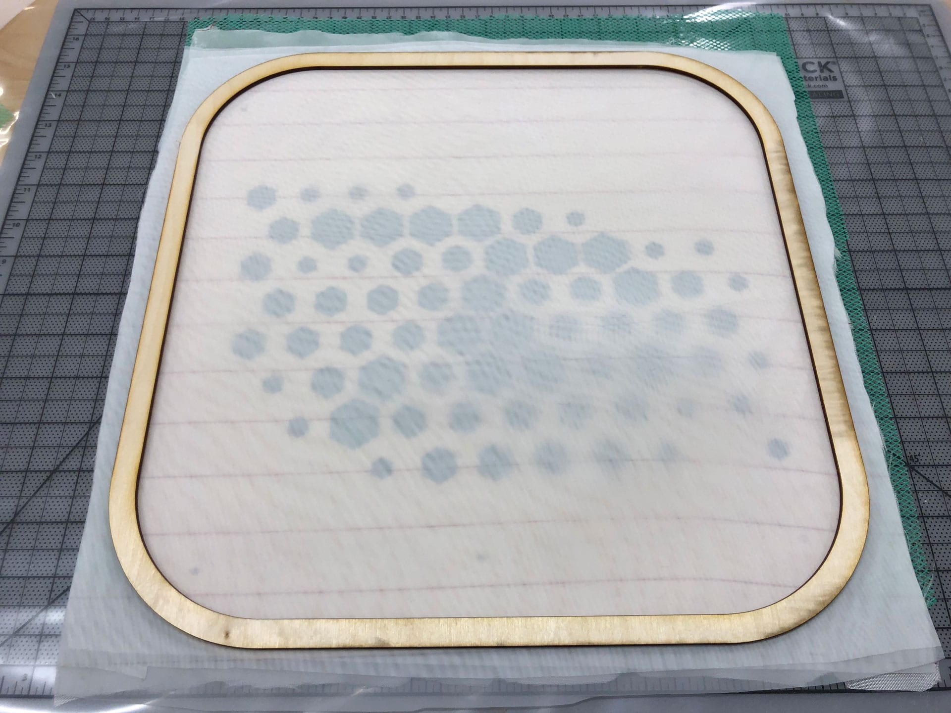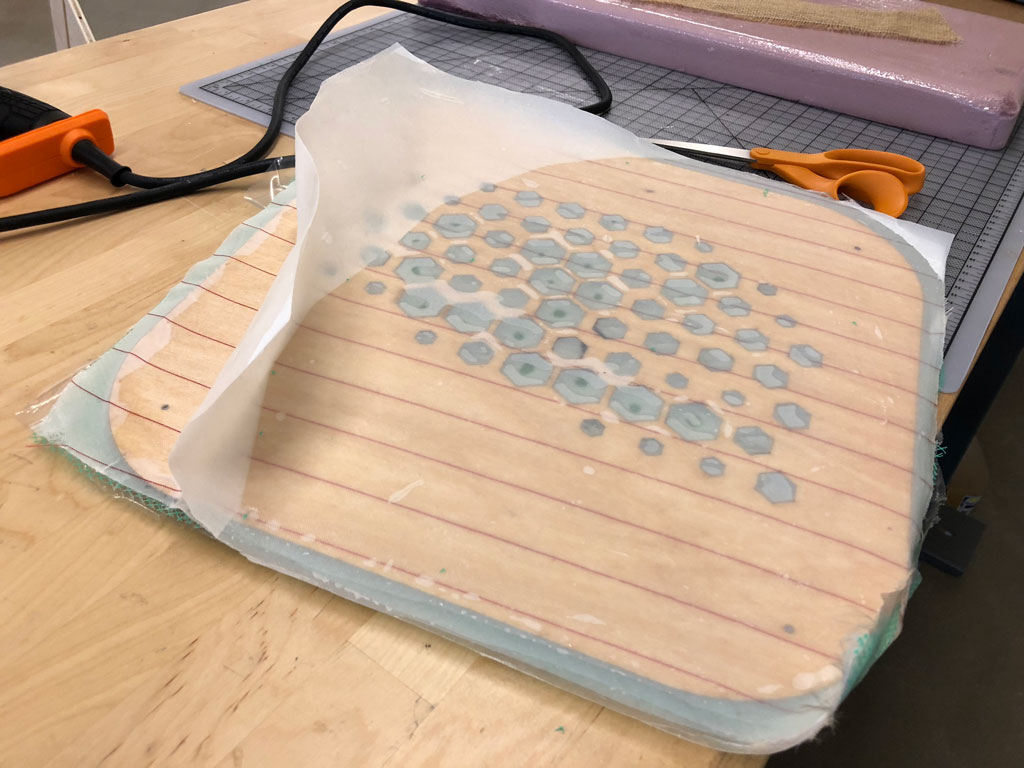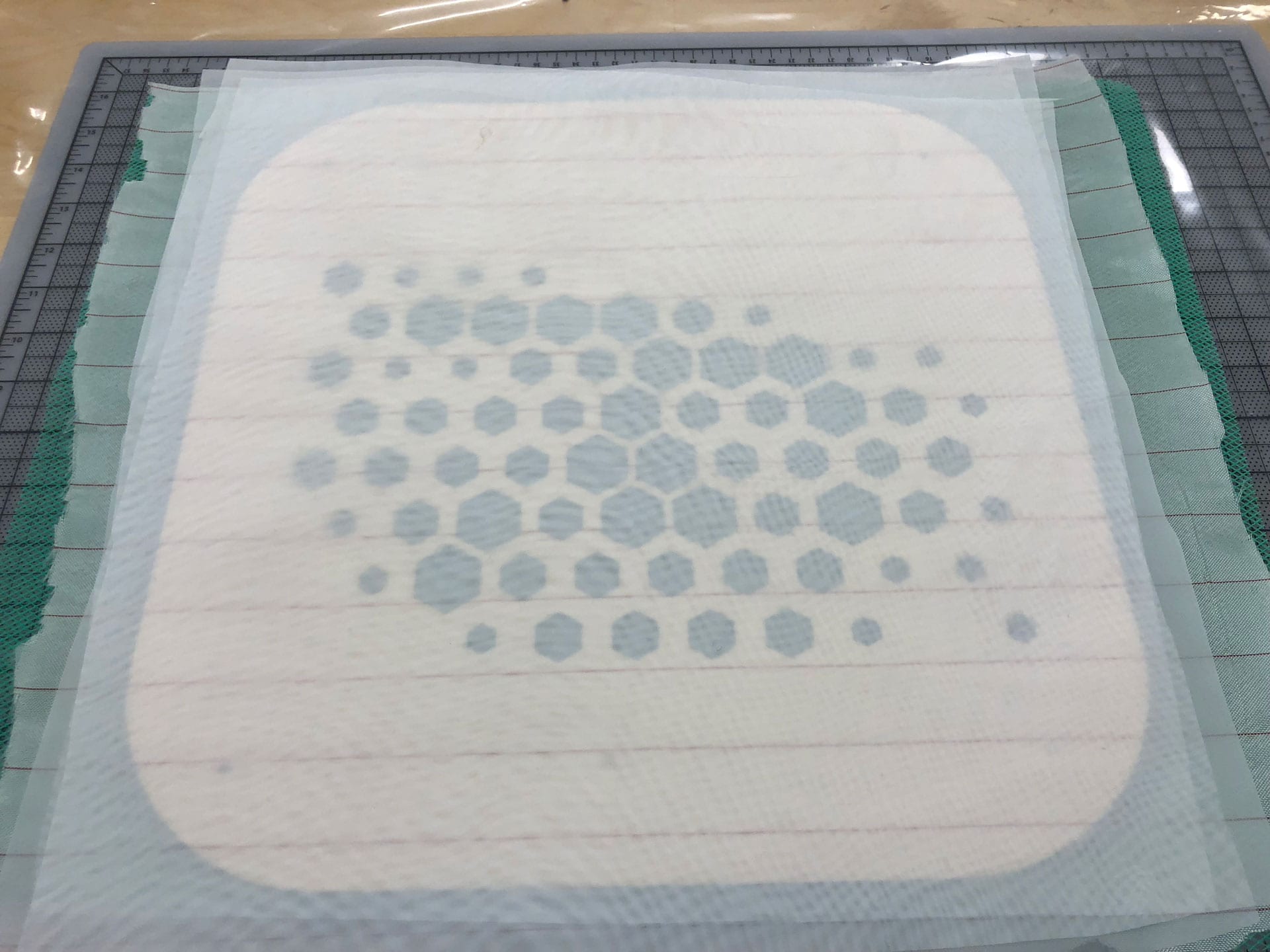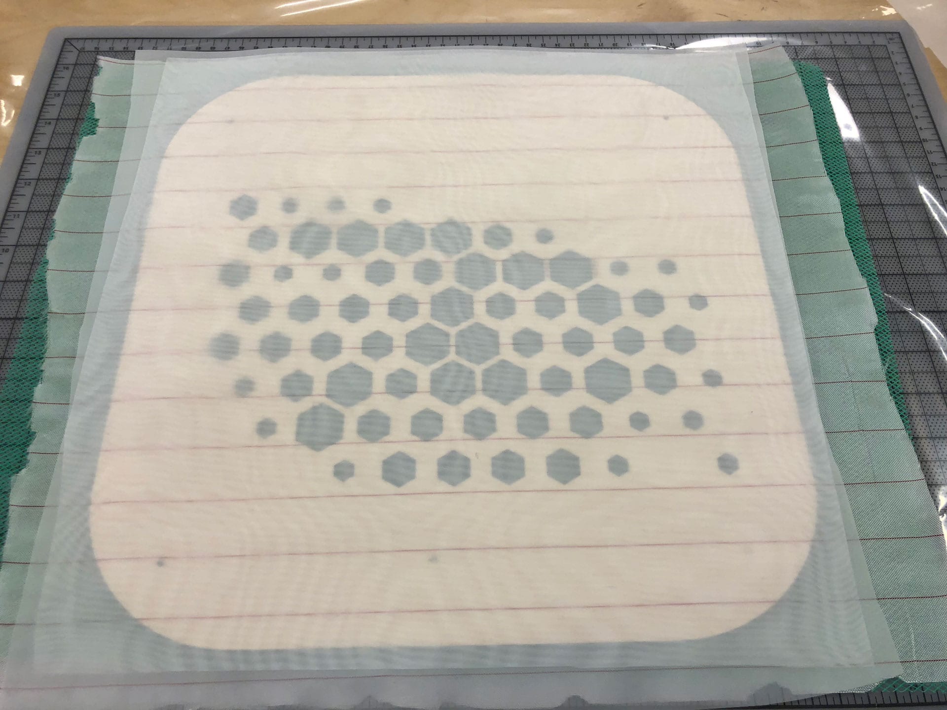 The final composite turned out really well. It took some effort to pry the composite off of the Peel ply, but it came off clean. The 3 layers of the mesh fabric in the composite created a translucent-milky white diffusion that should be just right for the LED lights that are integrated into my facade. I trimmed off the edges with a sharp exacto blade. Given the thinness of the mesh material, I was still able to bend it and it's soft enough that I can easily trim the edges with an Xacto blade. In the future, I'd like to experiment more with this composite mesh material. It seems ideal for creating curved forms that require some rigidity but can bend and take on different shapes. The composite is firm enough for my application and I plan to use this as part of the facade for Pixie.