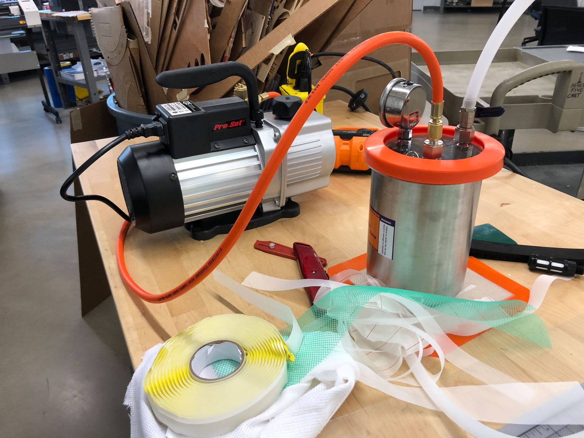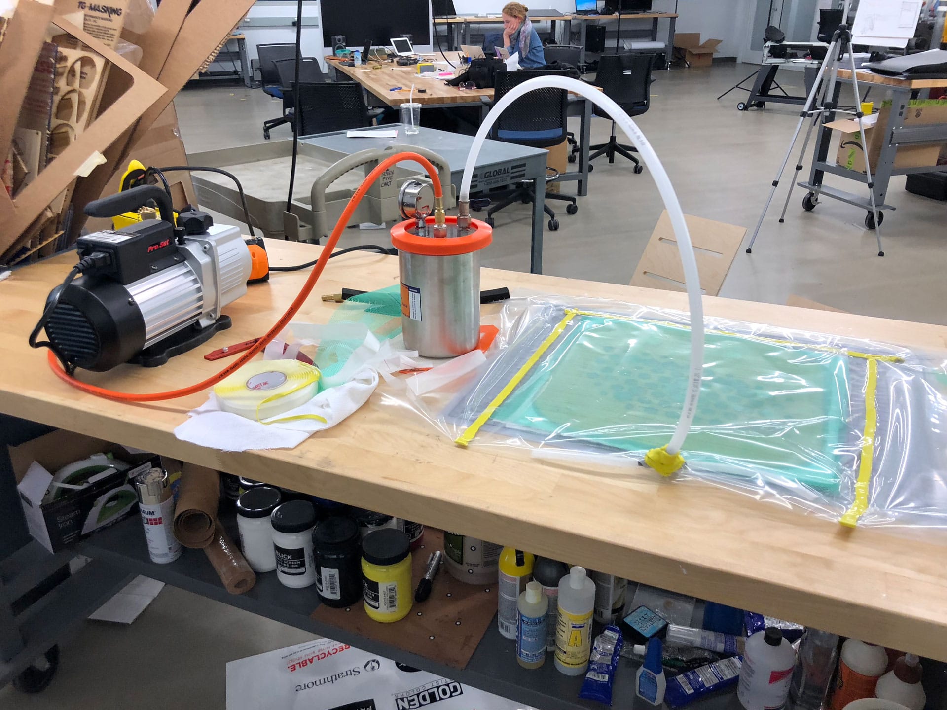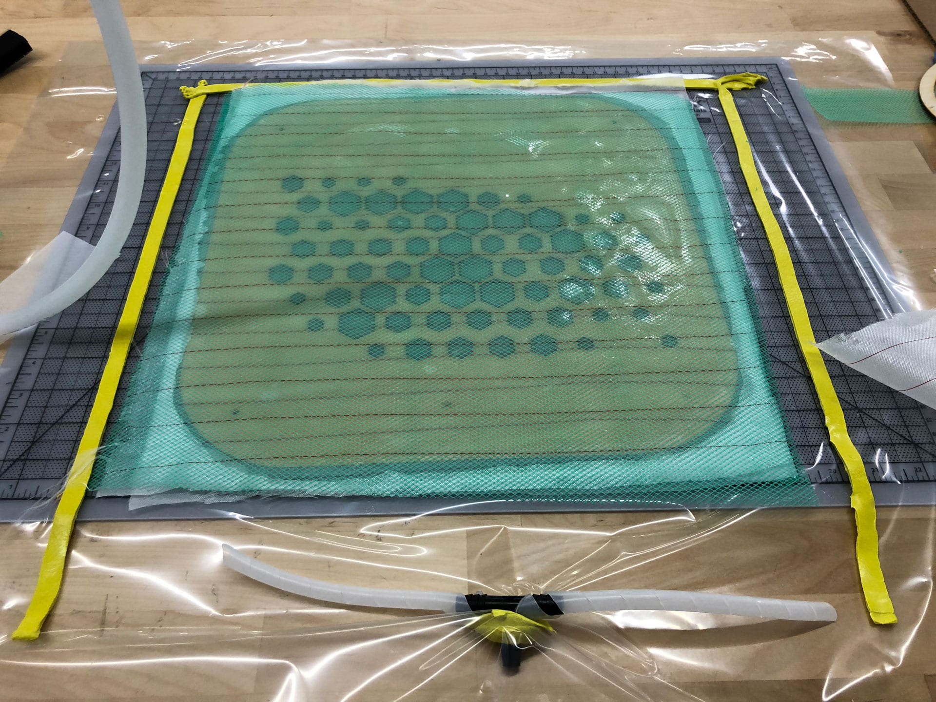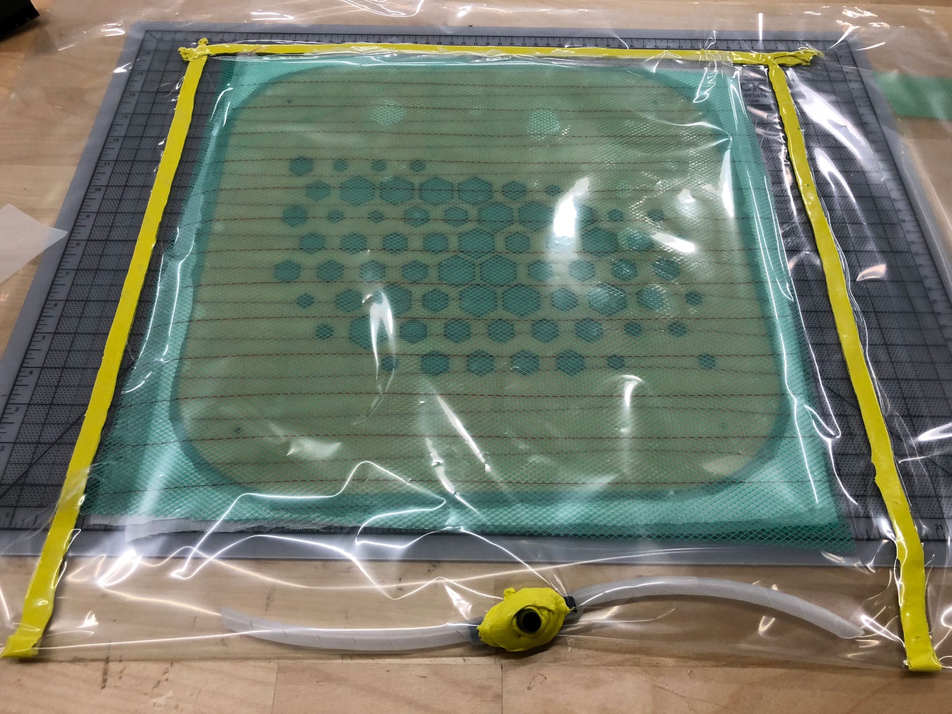 To create the composite, you need to create a mold, lay the layers on top of the mold with the resin and then vacuum seal all the pieces in a plastic bag and compact the layers by sucking out all the air from the bag.