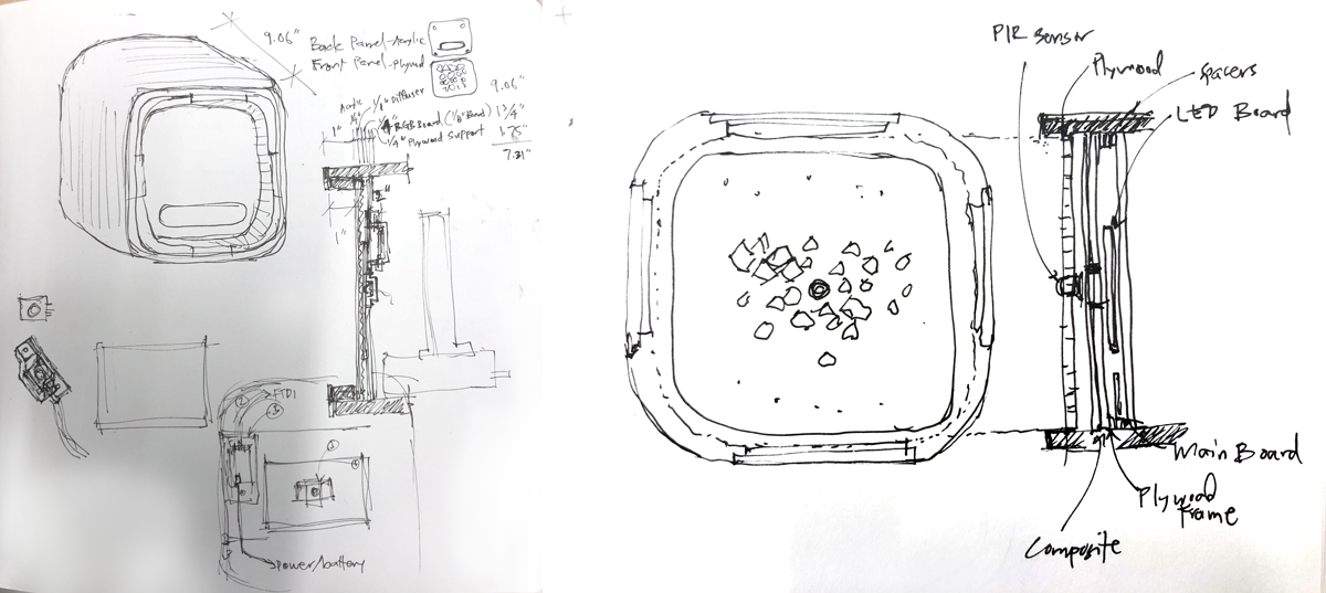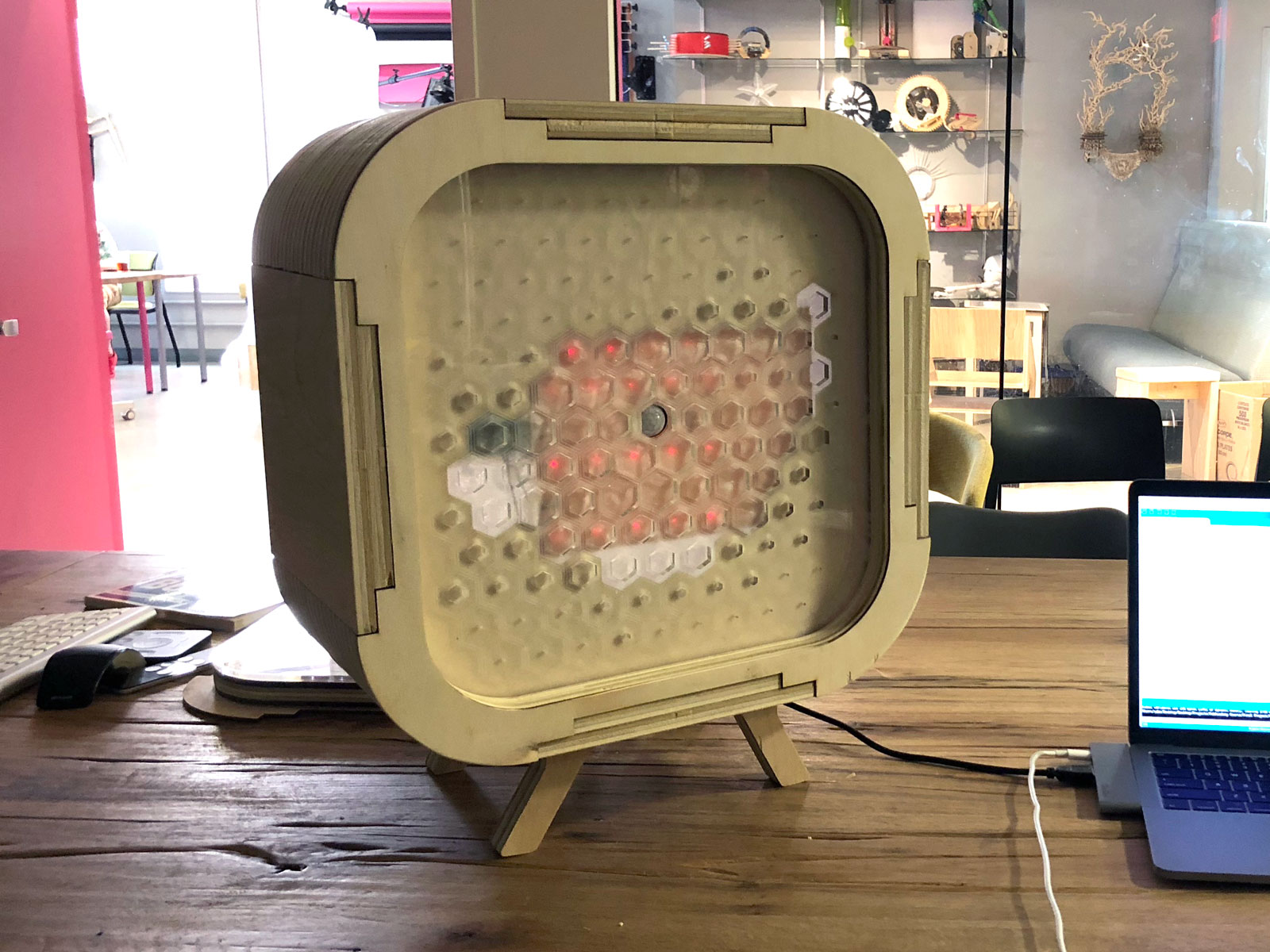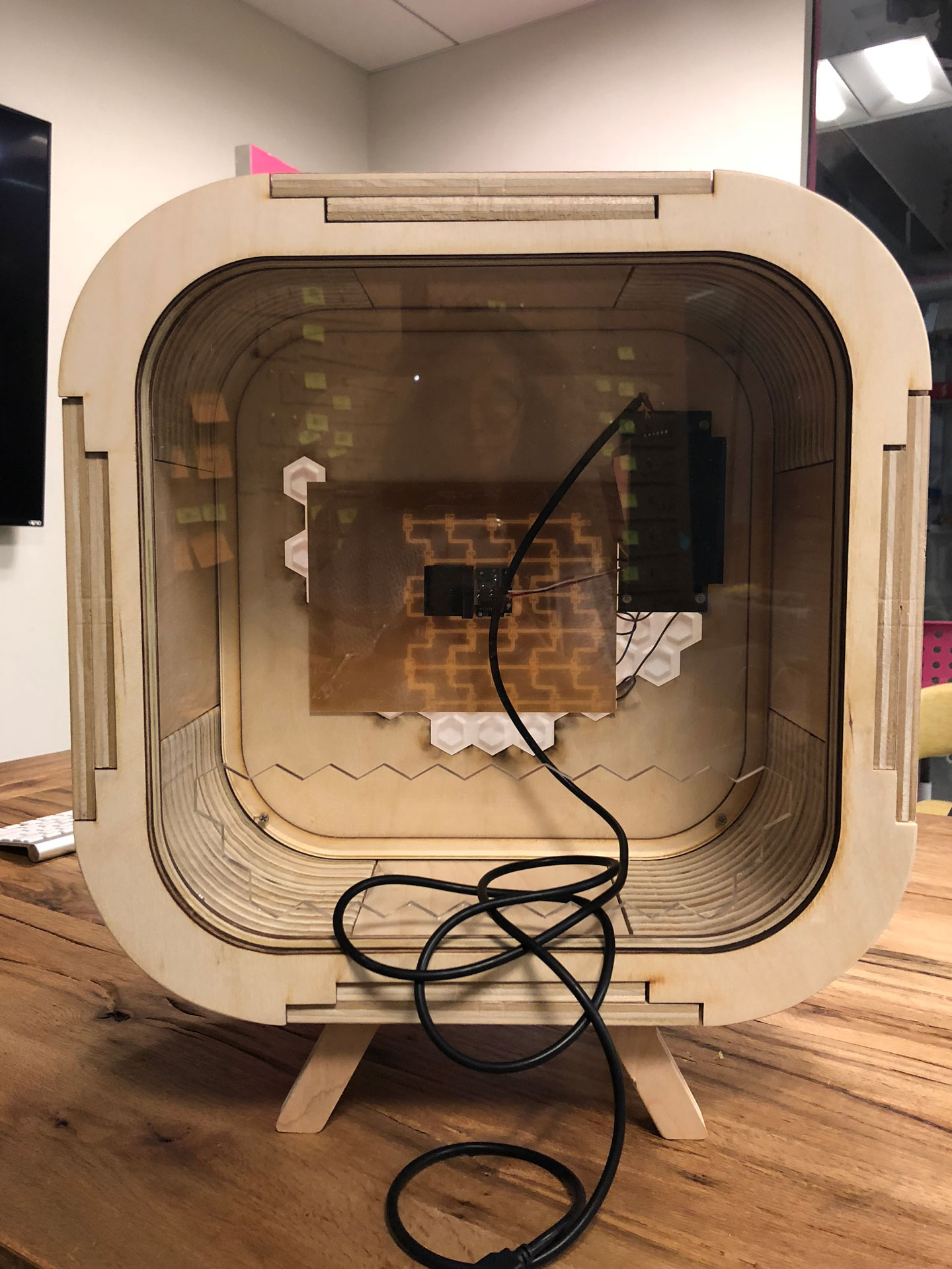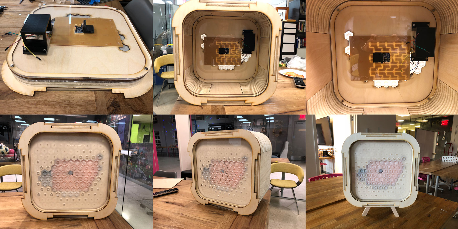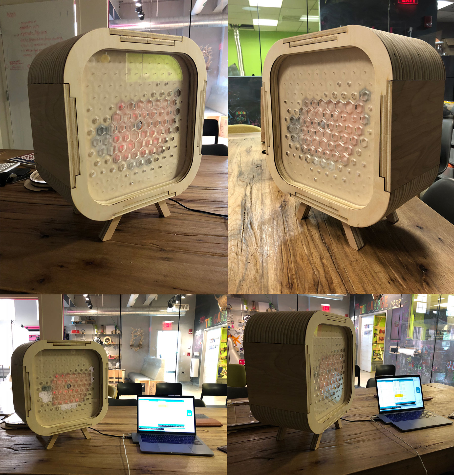 My idea was to flip the notion of a homogeneous, static, and one-directional TV screen into an ever-changing, interactive, and bidirectional screen. Pixie, my final project, engages in this discussion. Pixie has a screen that is forever changing. Unlike a TV in which its qualities remain fixed over time, users can build different screens or facades that can be attached to Pixie’s box frame to create different interactions. Pixie operates in 3 states: