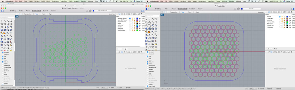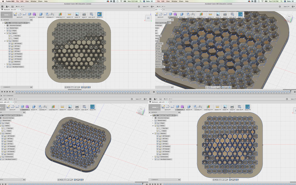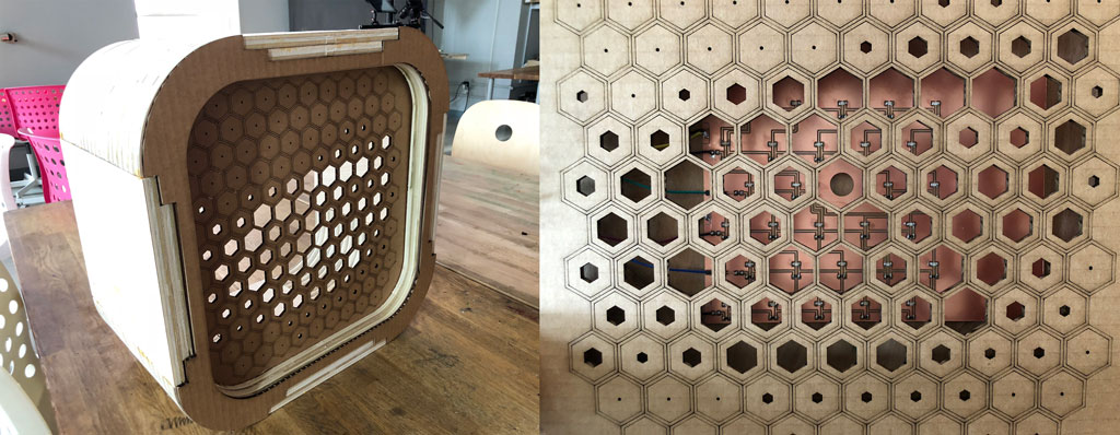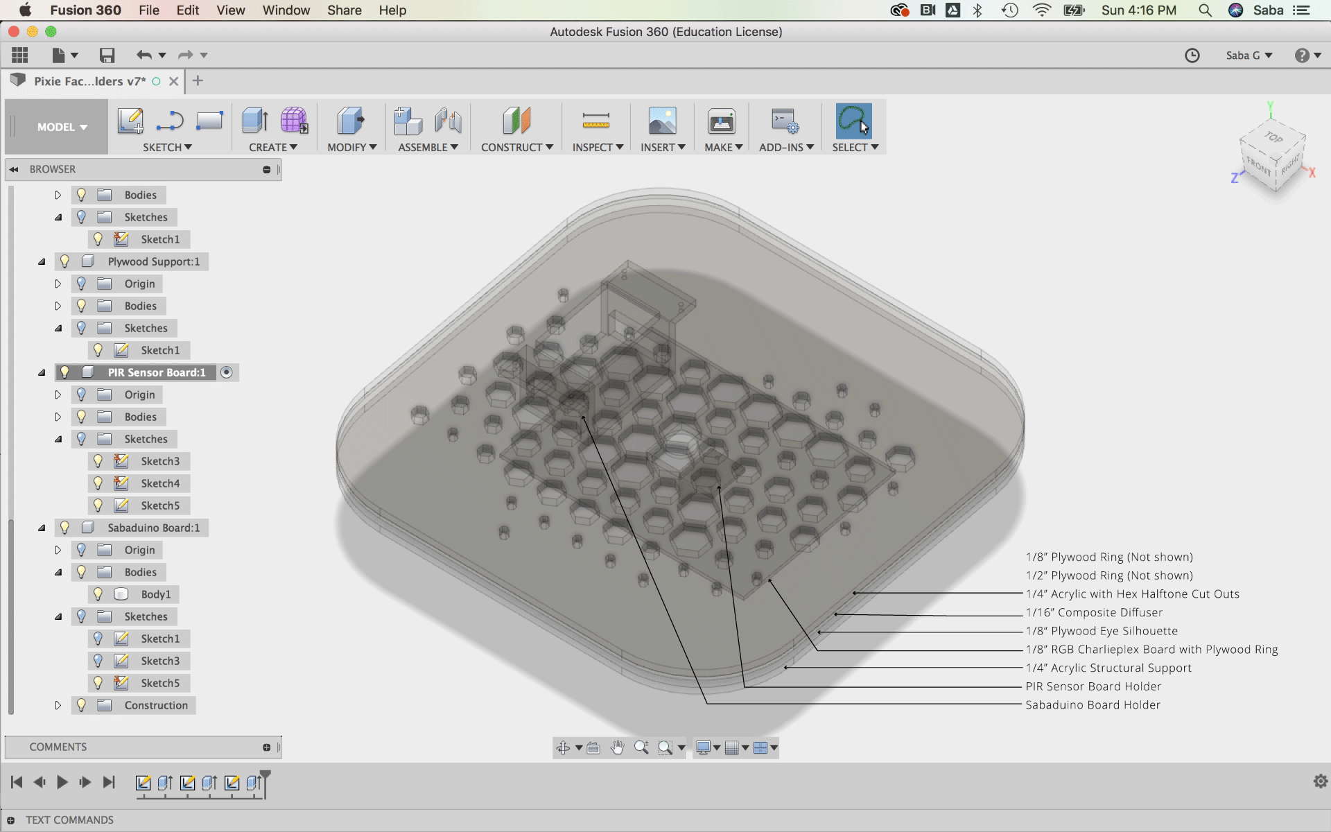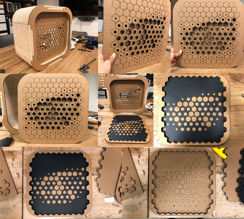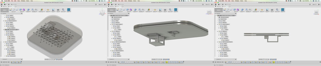 I created quite a few iterations of the Halftone Screen using Fusion 360 and Rhino: a CNC milled plywood version, a layered laser cut plywood version, and finally an acrylic and composite based version. I also used Fusion 360 to model how the different screen layers fit together and also used this model to design 3D printed holders for my boards (Sabaduino Board and PIR Sensor Board). Once I had tested the various screens, I decided on the acrylic-plywood screen and laser cut the pieces.