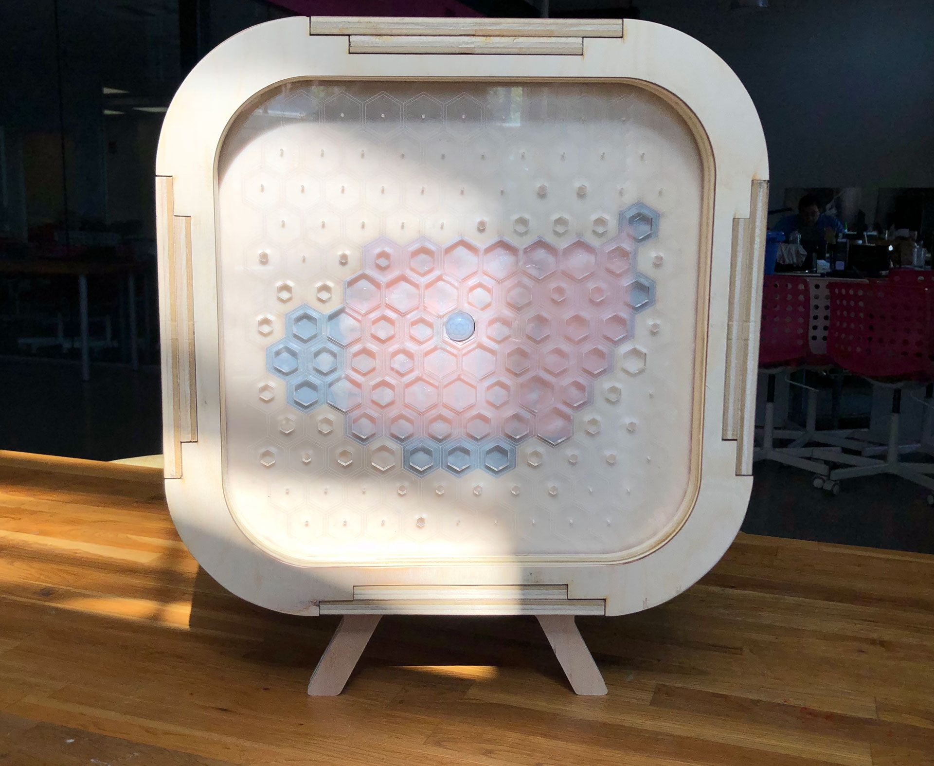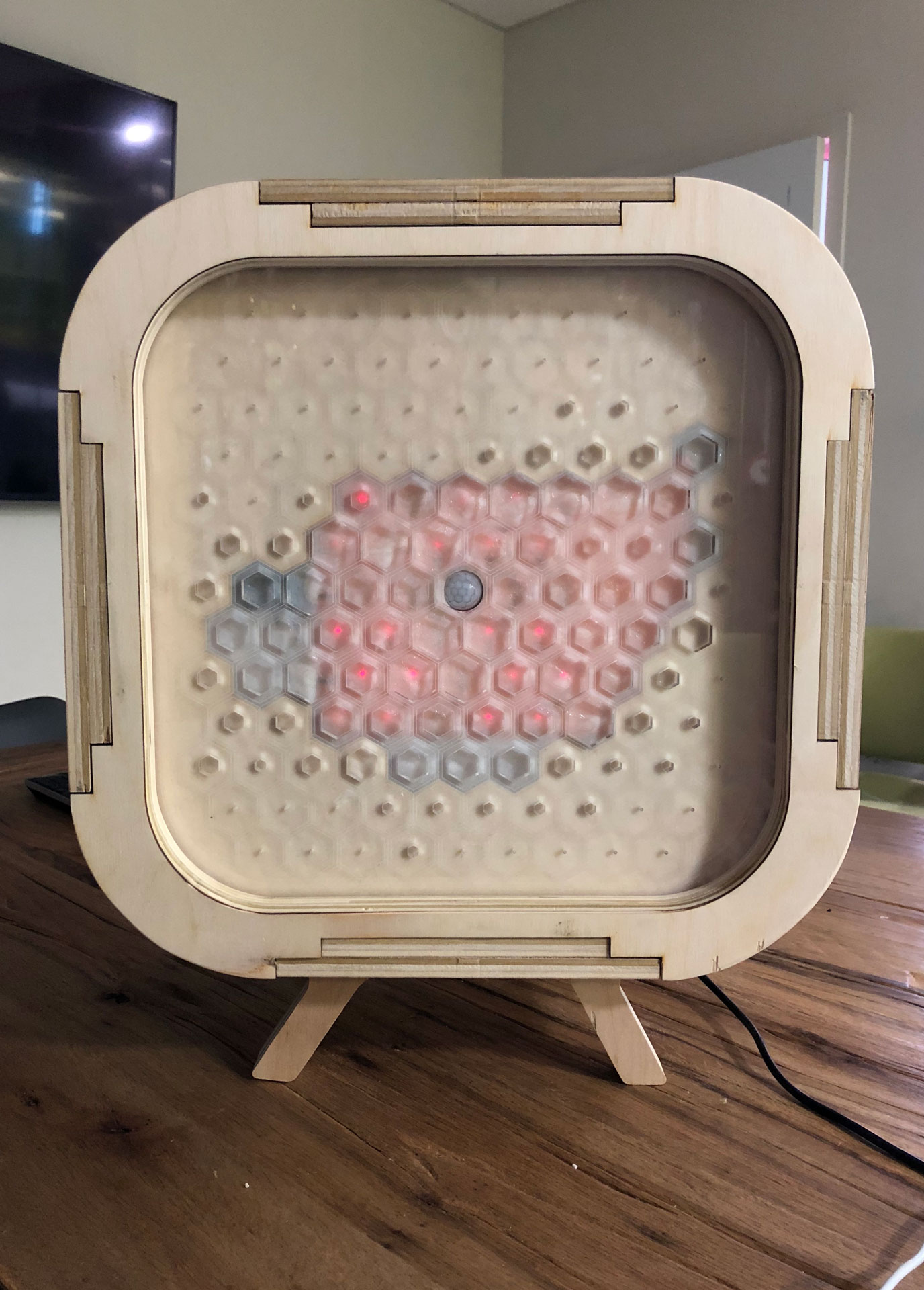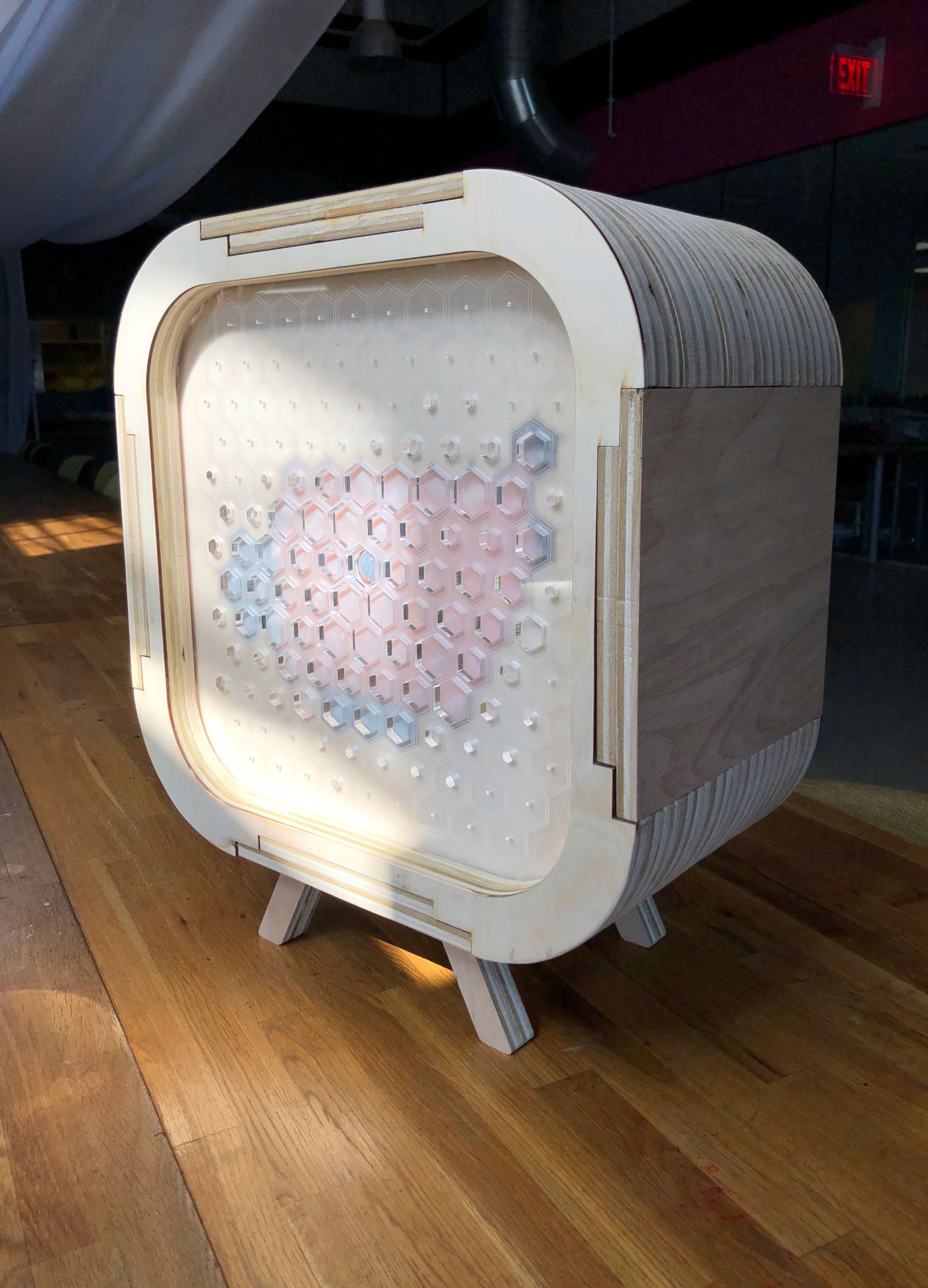 For the Halftone Screen, I created an abstract eye using the halftone process. Typically, we stare at TVs and screens in a singular, one-directional manner, but here the TV looks back bi-directionally. Pixie’s eye looks back at you, observing you and the environment. The iris portion of the eye is lit by a 6x5 matrix of 30 red LEDs that turn on with movement in front of the TV and can be programmed directly to display different images and text.
