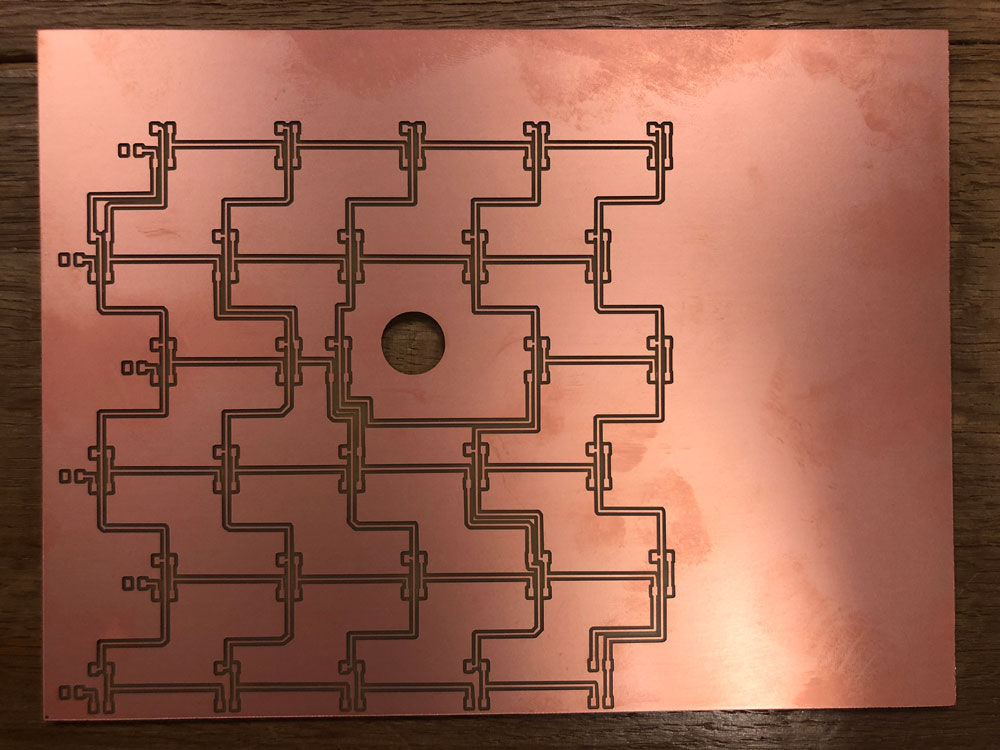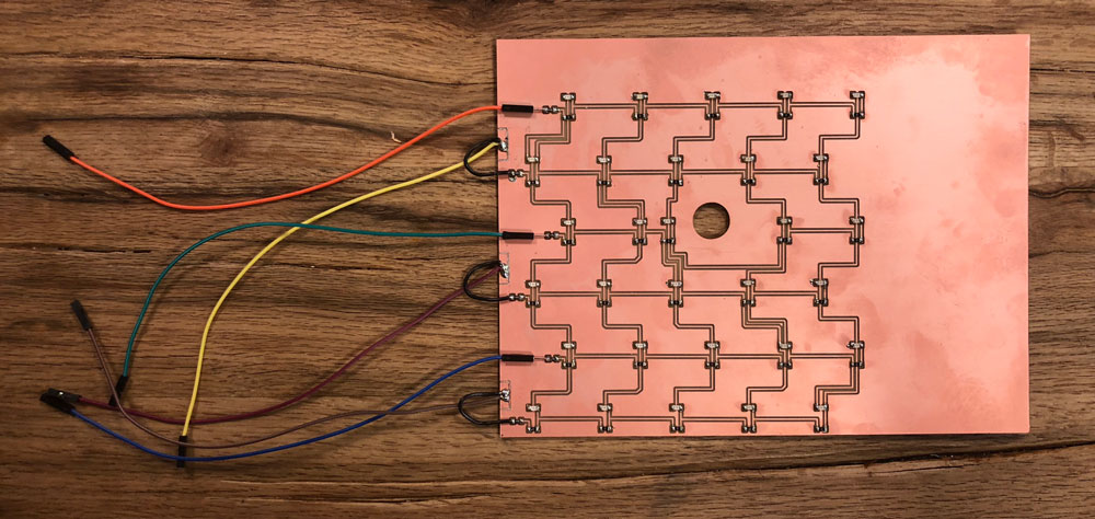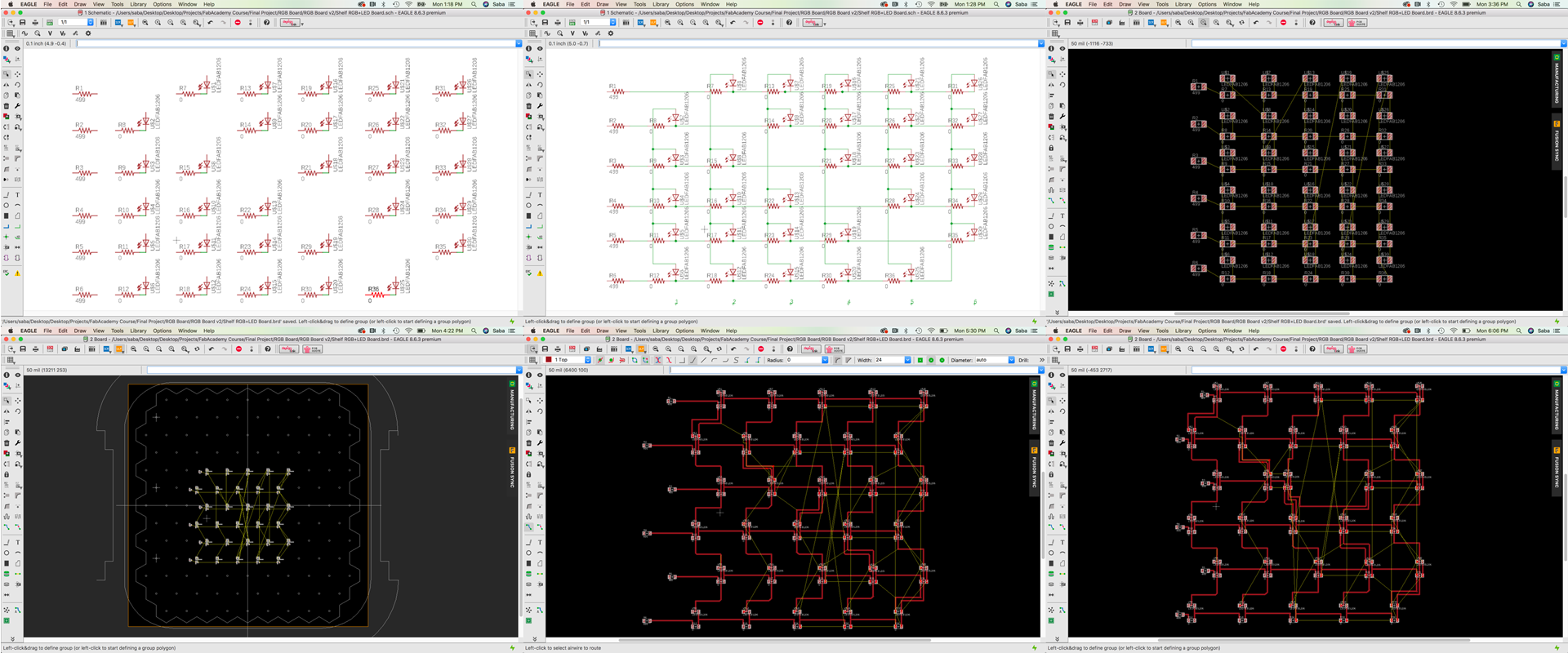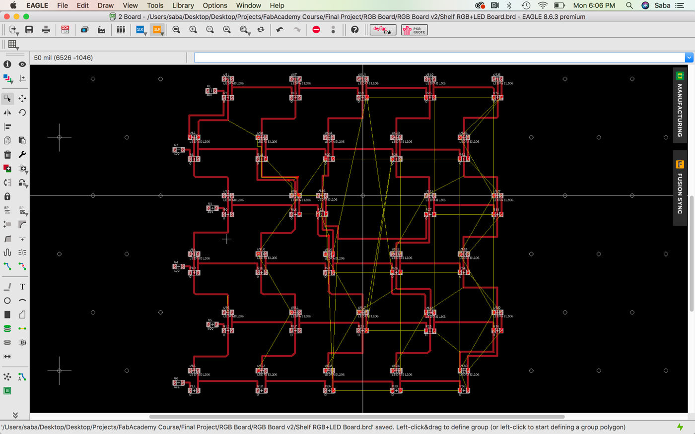 To create the matrix of LEDs for my Halftone Screen, I decided to use the charlieplexing method as a means to minimize the number of output pins connected to my Sabaduino Board. I worked on a 6x5 matrix of LEDs and mapped the traces in Eagle. I learned a lot about Charlieplexing online, and found the Instructables post to be quite helpful. It took some time to organize the board and place the LEDs in the exact position of the openings of my Halftone hex pattern. I imported a DXF into eagle of my Halftone screen which helped as a guide. I also added a hole where my PIR sensor would be located.