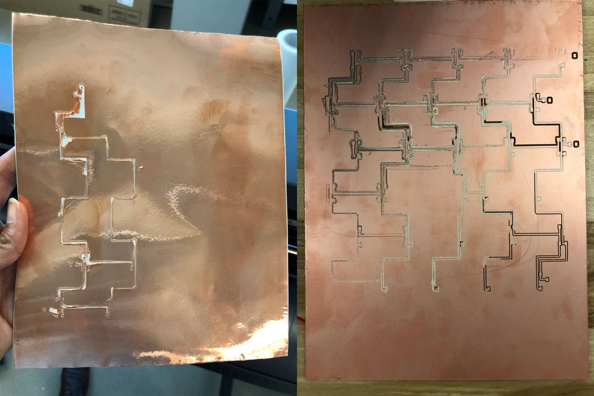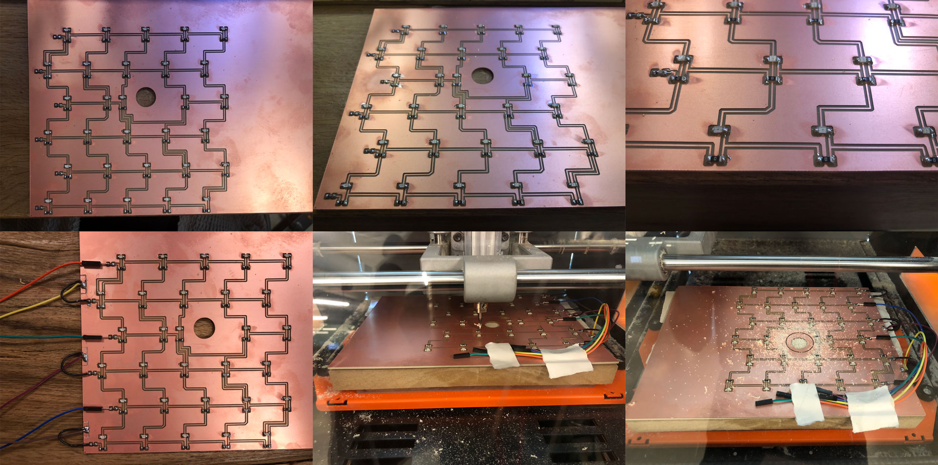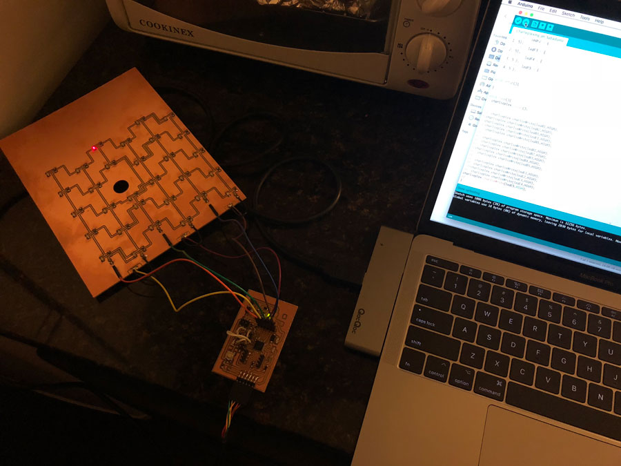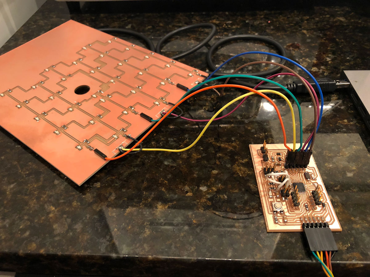 Realizing the large size of the board, I tried a couple of options as far as producing the board. I first attempted to vinyl cut the traces, but realized that given the thinness of the traces, it would be pretty difficult. I then tried tomill the board using the Roland SRM-20 in our FabLab, but didn’t get a consistent cut throughout the board and despite being taped down, the board was moving on the sacrificial material quite a bit. With Luciano’s help (one of our instructors), I finally was able to mill a successful board using the Roland machine at the CiC in Boston. I stuffed the board with the LEDs and resistors, and also added the connecting cables. I realized that the hole that I had drawn in Eagle for the PIR sensor was too small, so I braved re-cutting the hole with the components on the board in our Roland machine. I held my breath as the machine cut out the larger hole (barely missing a few components - whew!).