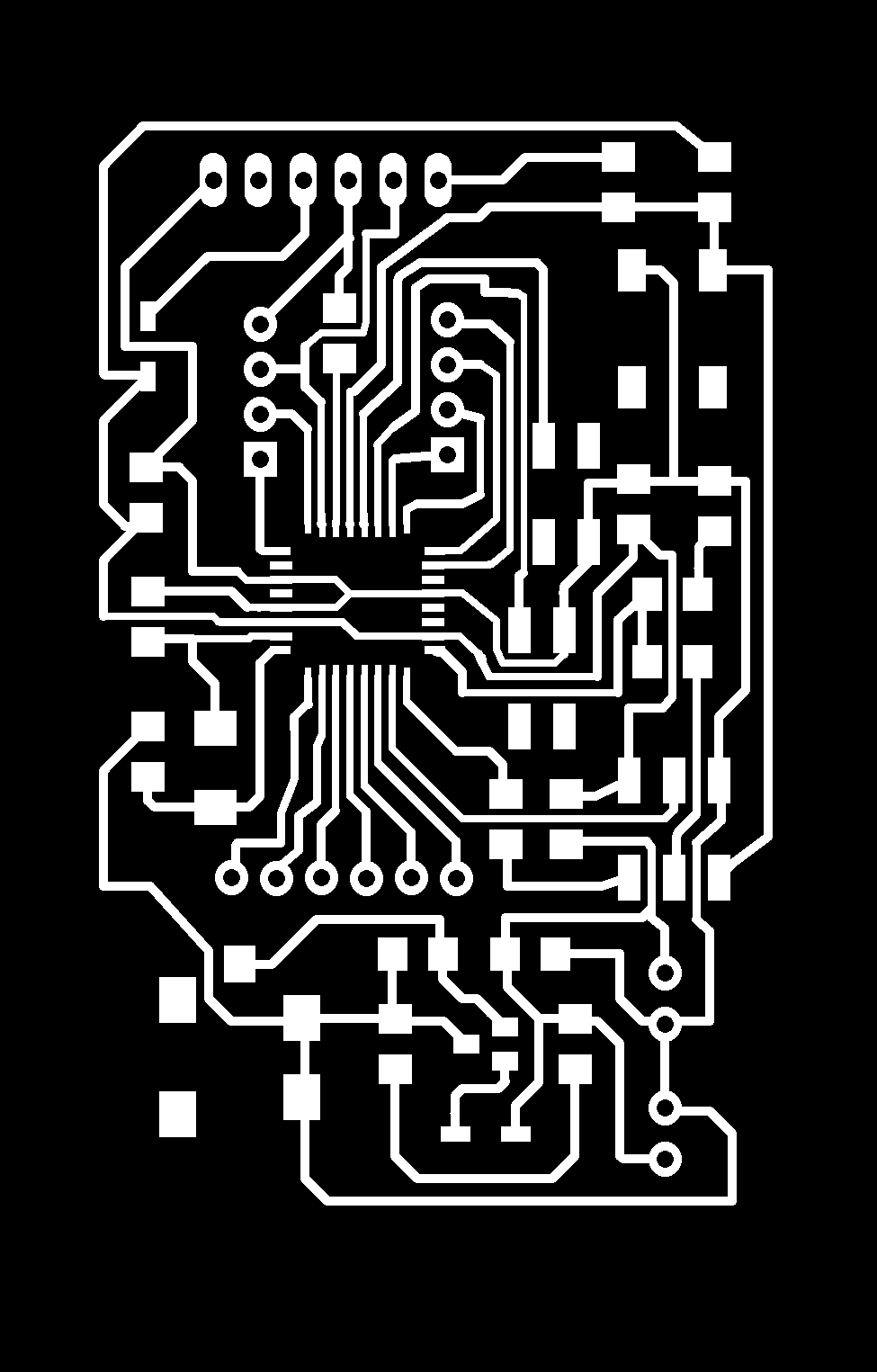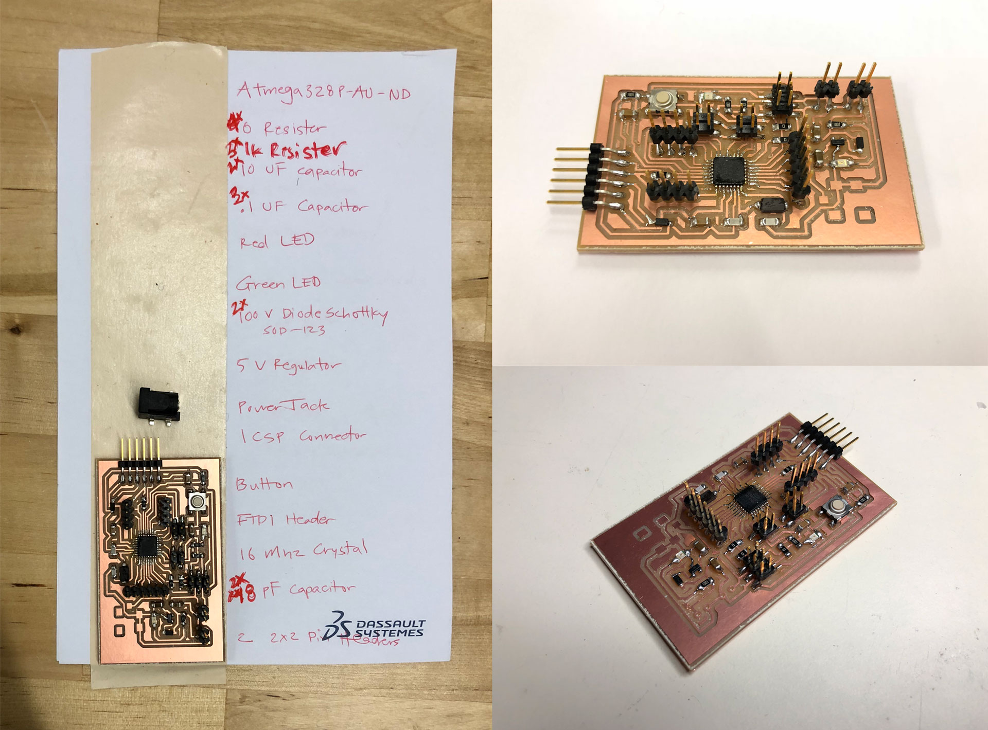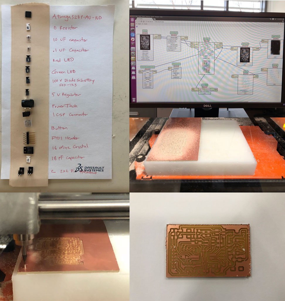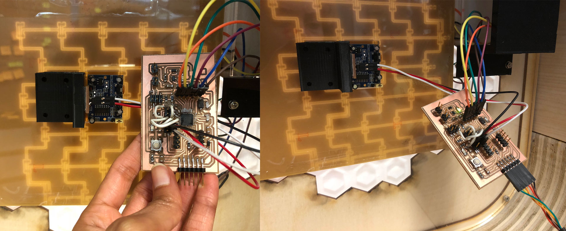 After designing my Sabaduino board in Eagle, I milled it using the Roland SRM 20 at our lab. It took a couple of tries to mill the board and make sure all the traces cut through. I stuffed the board with all the components and nearly forgot that I had to add some jumper wires to connect 2 traces. Being a single-sided board and given the complexity of the trace layout and desire to maintain a very small footprint, I could not get the traces to be designed without overlapping, so instead I opted to solder a couple of jumper wires to connect two connections. A couple of weeks later, I worked on a new board design that eliminated the need for these jumper cables. This second board (Sabaduino 2.0) is larger than my Sabaduino 1.0 board, but I realized that in my final project, I have extra space for a larger board anyway.