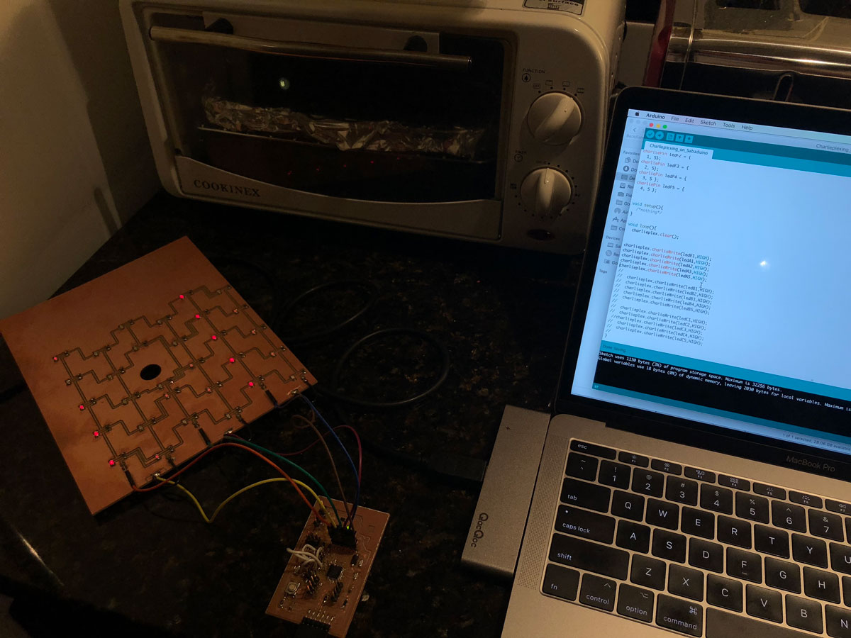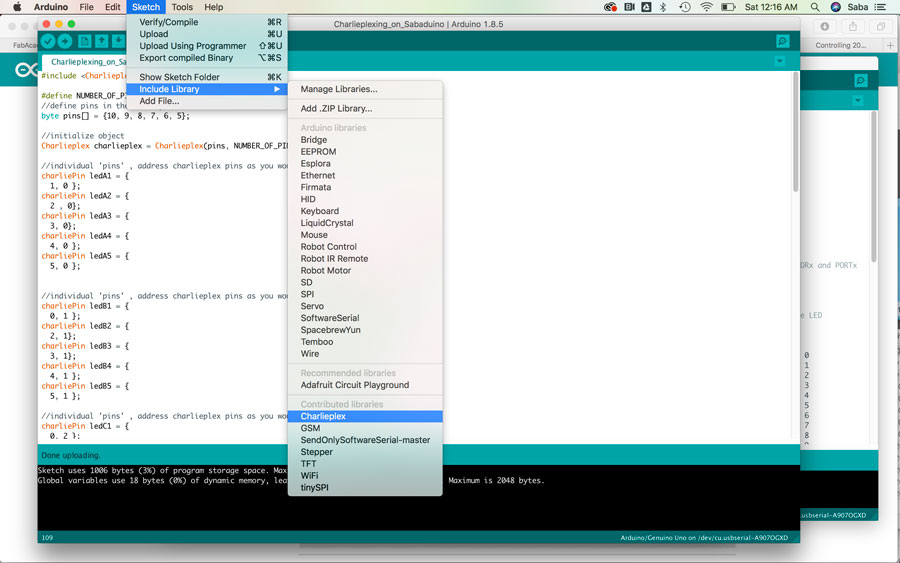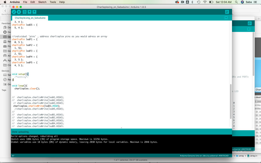 The first part of my programming sequence was to test my Charlieplex Board. I downloaded the Arduino Charlieplex library and installed it in the library folder of Arduino.