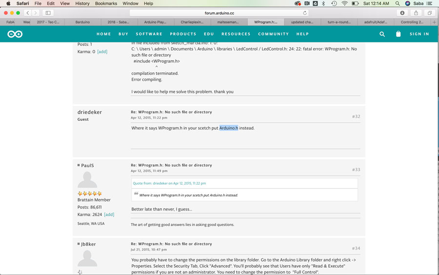 I connected my Charlieplex Board to my Sabaduino Board, and then tried to upload the code onto my board, but kept getting an error message around the Charlieplex library that stated “WProgram.h: No such file or directory.” I did some research online and saw some posts around the WProgram.h library within the Charlieplex library needing to be updated to a different library when using the newer Arduino Unos. I updated this library in the Charlieplex library code from “WProgram.h” to Arduino.h” and tried uploading my code again. It worked! I was able to upload the code and a pixel on my Charlieplex board lit up.