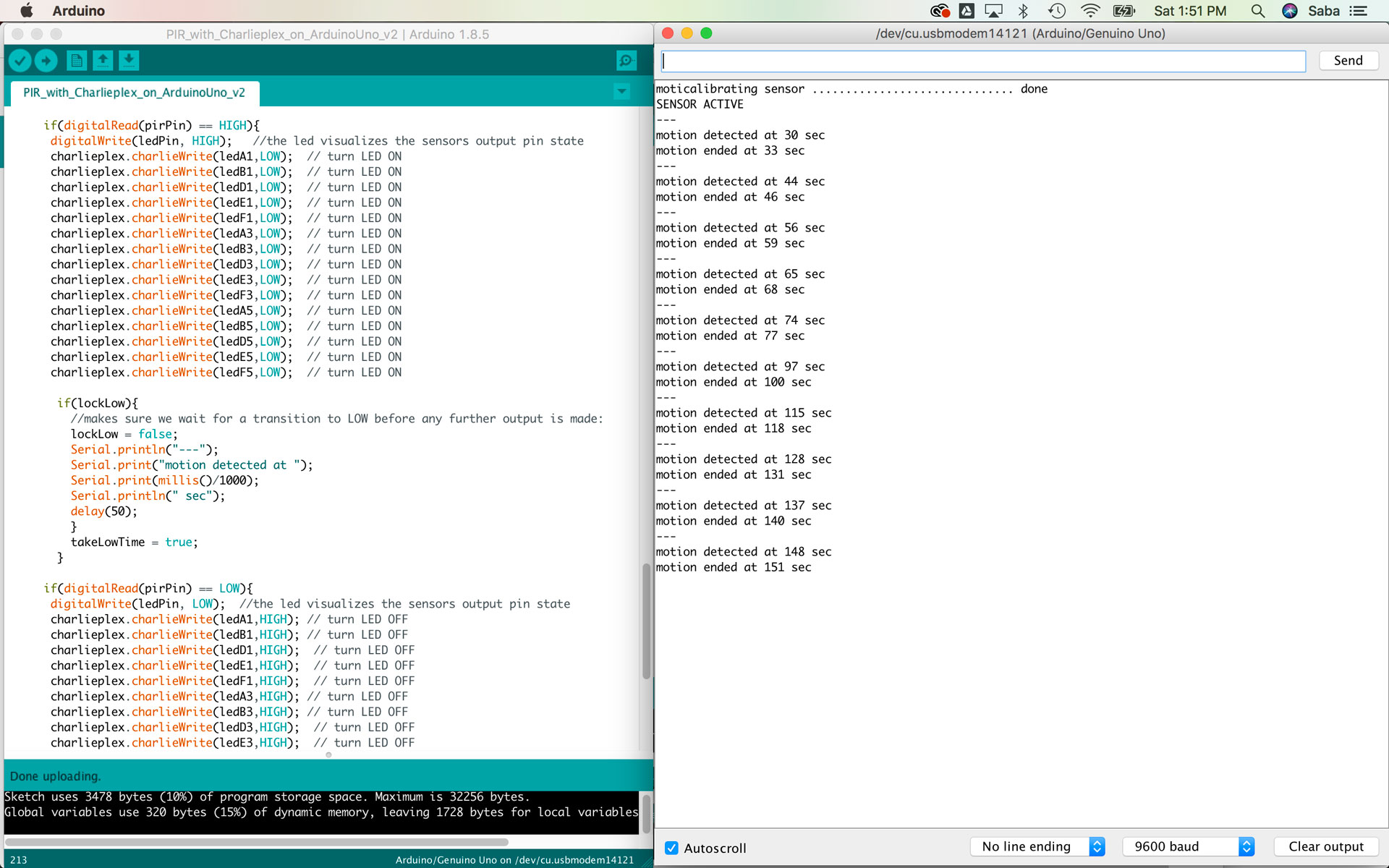 I then integrated this code with my Charlieplex and PIR sensor code, and it worked great.