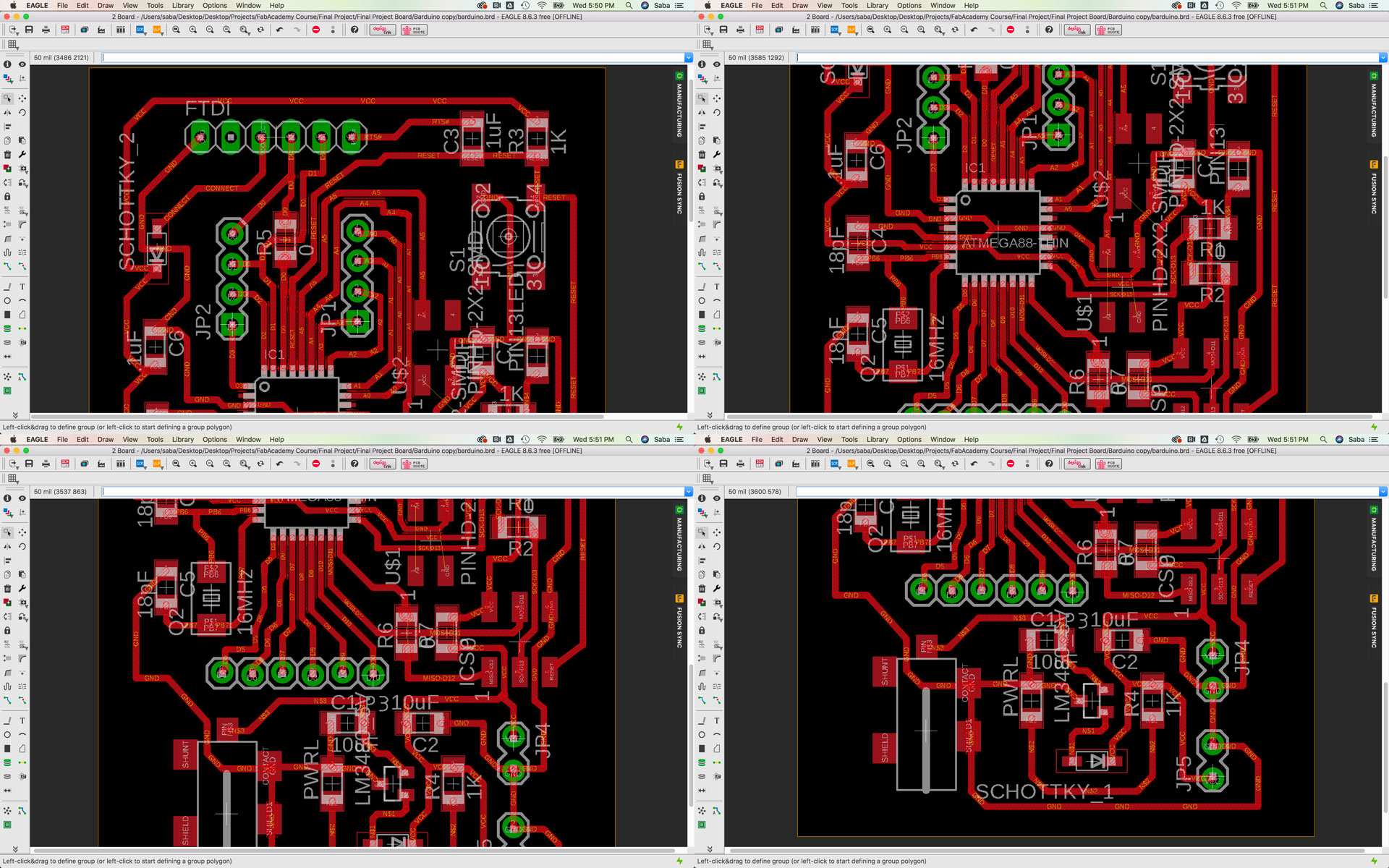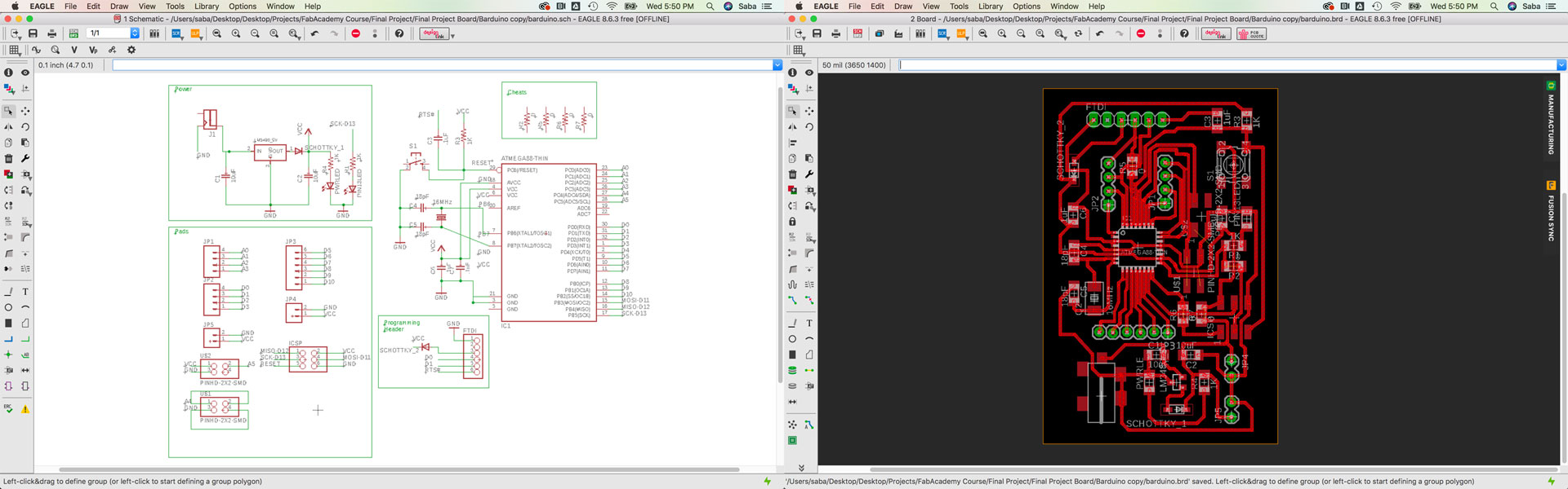 For my main board, I decided to use the ATMega328 microcontroller to allow for more flexibility in terms of inputs and outputs and also more memory for more extensive coding and programming. I based my design off Luciano’s Barduino Board. However, I added more input connectors/headers onto my board for my PIR Sensor and button. My main board is called the “Sabaduino” Board and is very akin to an Arduino board.