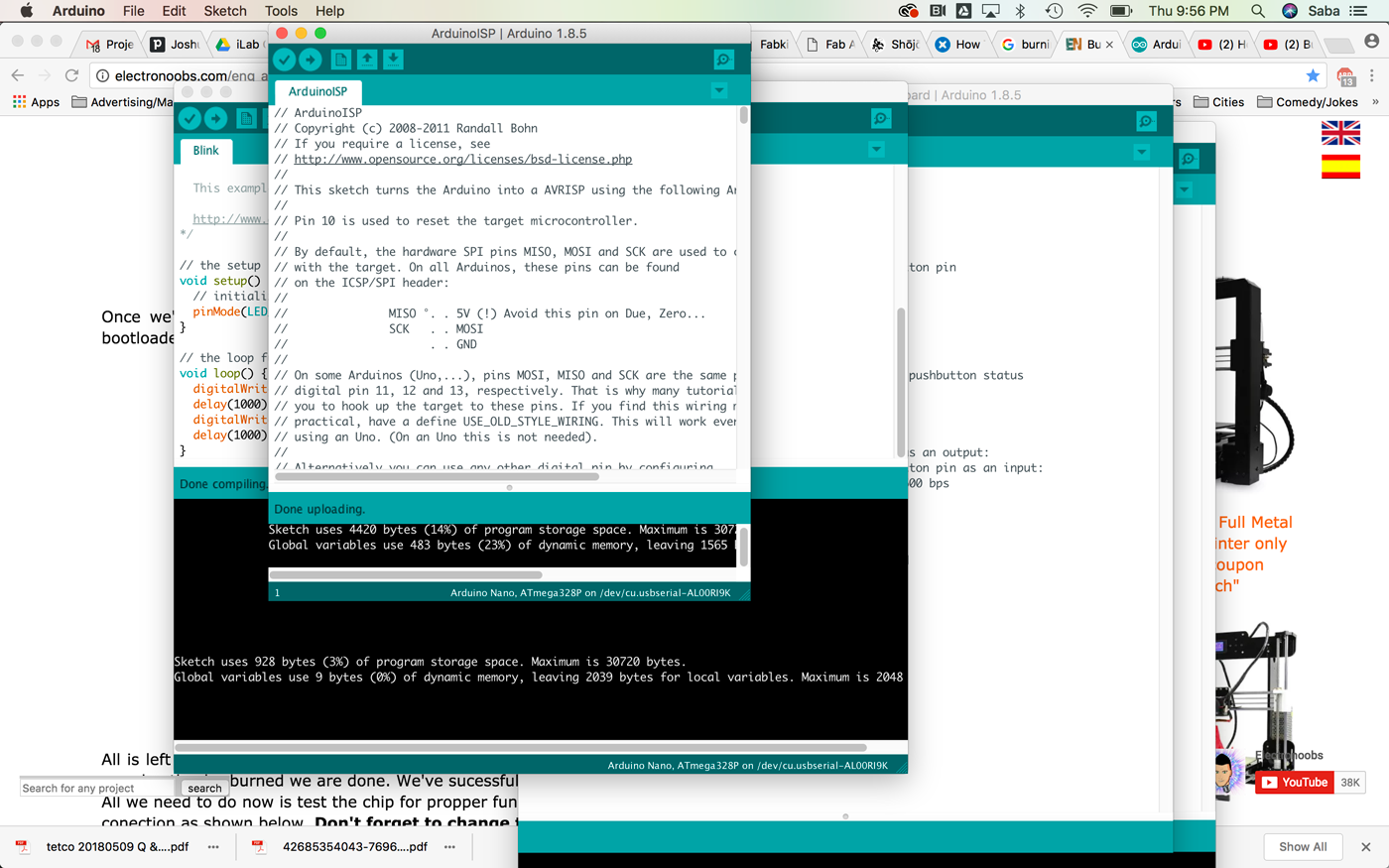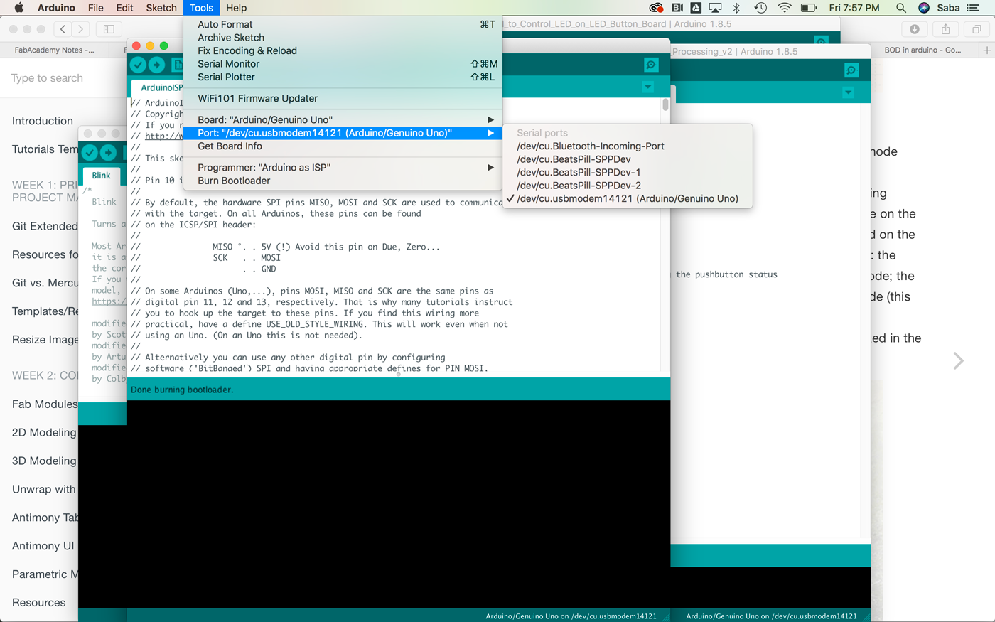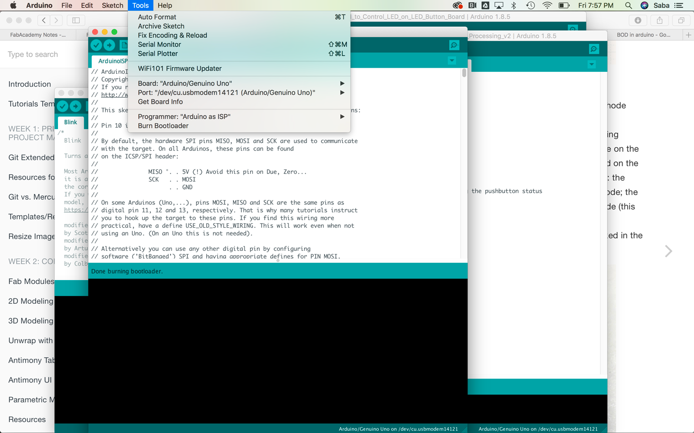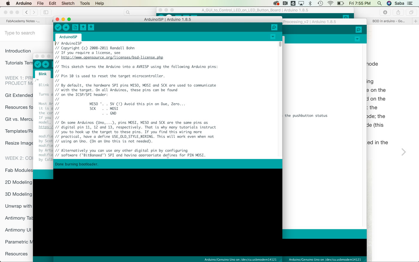 To set up my Sabaduino board, I had to burn the bootloader. I used the Arduino IDE to do this and an existing Arduino microcontroller board as the programmer since the specs are about the same. This took me a few tries, as I didn’t quite know what the settings should be for the board type and which Arduino board to use. I read online that many people had used the Arduino Nano to burn the bootloader onto their new Arduino-esque boards. I tried that quite a few times with different settings with no success. I finally decided to use a basic Arduino Uno with the most basic settings (Board set to Arduino Uno, Port set to appropriate port com, and Programmer set to “Arduino as ISP”), and viola! That worked seamlessly.