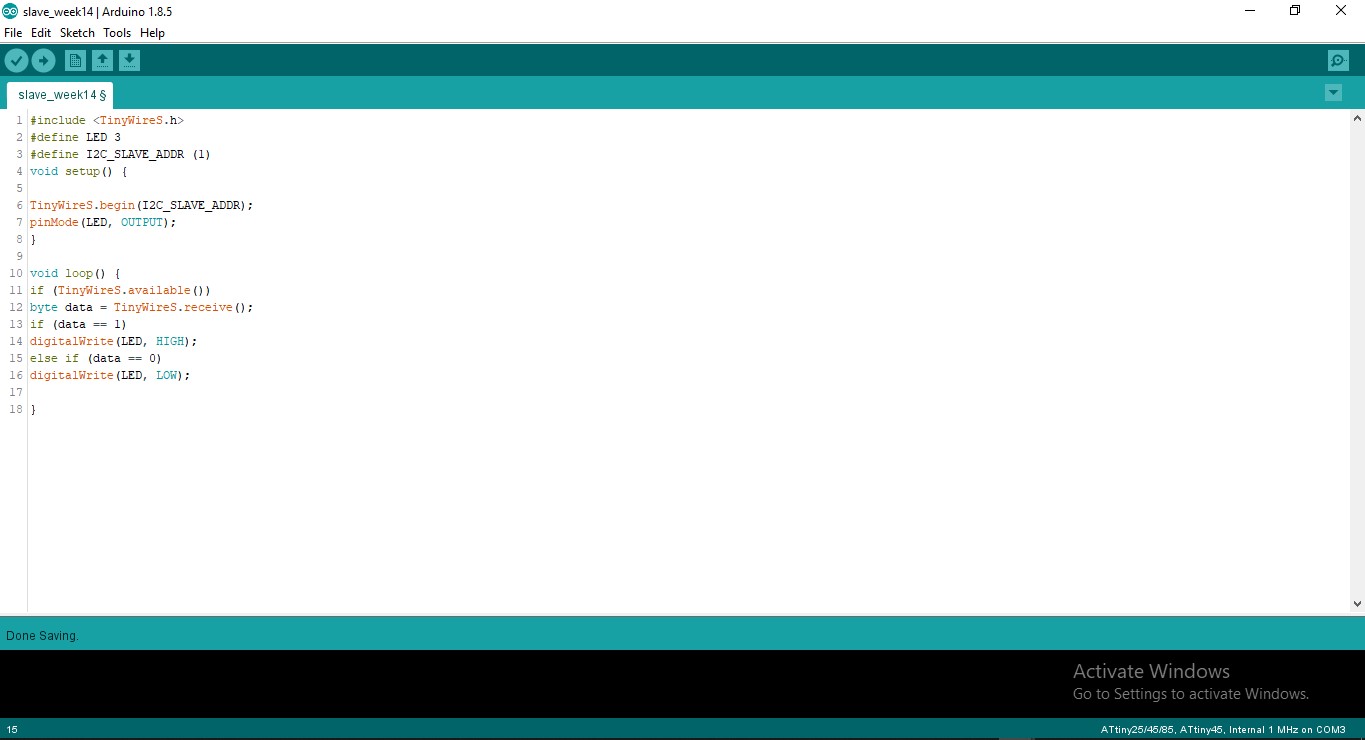 I uploaded the code to the master and slave boards. When i powered the board to by using the FabISP, i doesnt get the out put on the Slave board but the Master board is working fine. I go through code again and it is fine. Then i check ed the wiring of I2C bus, i was wrongly wired the I2C bus each other. I correct them and powered it again and Hola its working.