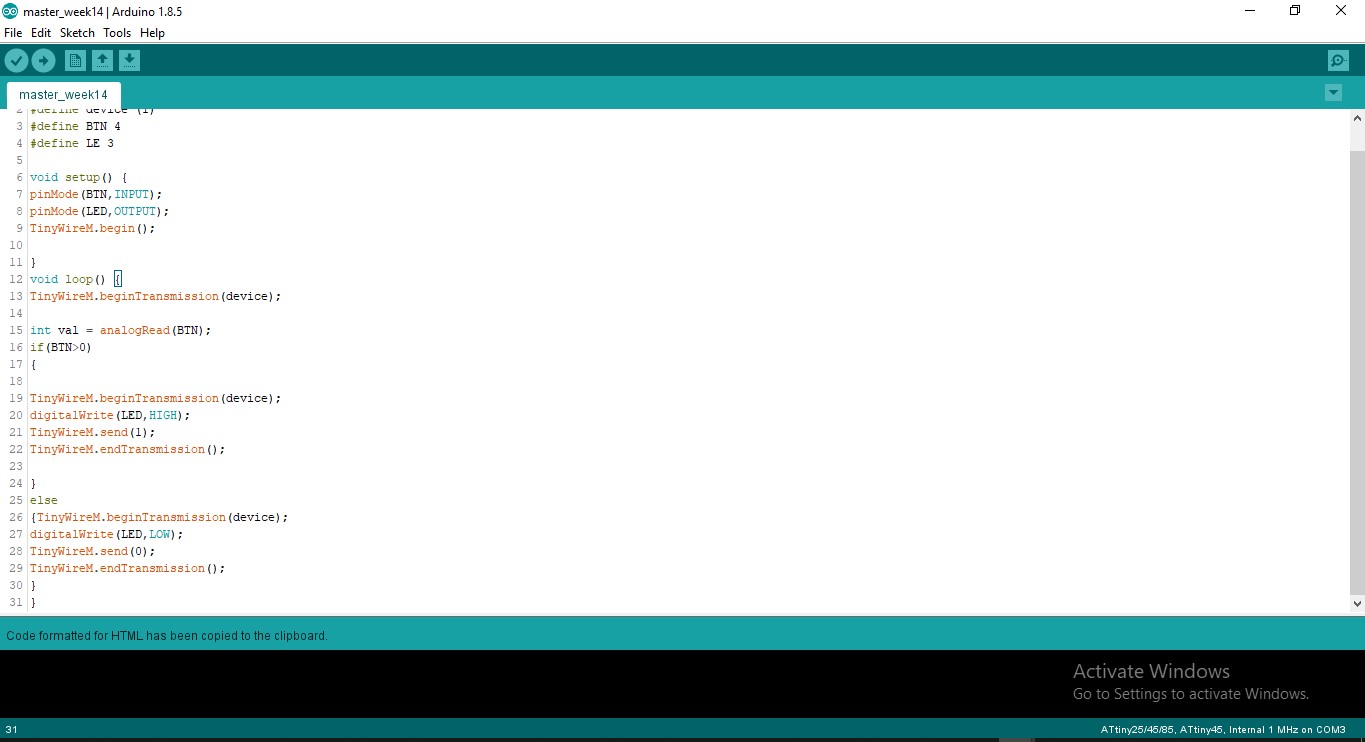 Now i need to write the code for the master to turn on the LEDs of both master and slave while the button press by using I2C communication.