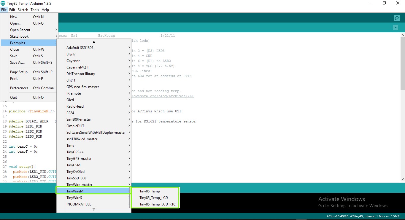 First i tried the Wire.h library that official given by the Arduino. But when compailing the wire.h library i got some error. So i googled and saw some answers from arduino forum that wire.h library wont work with attiny45 microcontrollers. As i xpected it happened. So now, i need to find another way. I searched for alternative arduino libaries that especially build for attiny microcontrollers. I found TinyWire.h library for arduino. The TinyWire.h library is build a for attiny microcontrollers. The library almost replicate the Wire.h. Visit the github repository for more info about the library.