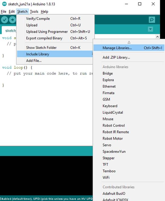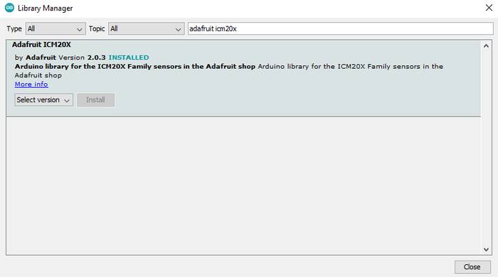 To facilitate the work of reading the data from the IMU I used a library developed by Adafruit for this IC ICM20X. To add the library you have to go to Sketch->Include Library->Manage Libraries...