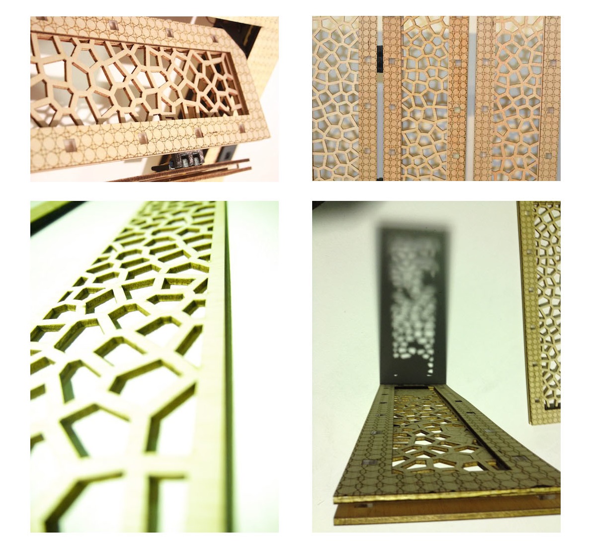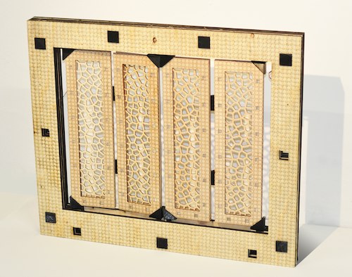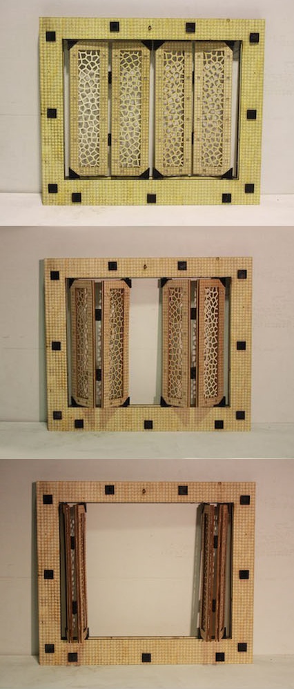 THESE ACTUATED SHUTTERS ARE PROGRAMMABLE TO FOLD AND UNFOLD DEPENDING ON LIGHT CONDITIONS. MADE UP OF MUTIPLE LAYERS, THE OPERABLE PARTS OF THE SHUTTER ARE DESIGNED TO ALLOW FOR USER CUSTOMIZATION, THROUGH THE ALTERNATION OF DESIGNS PLACED WITHIN THE EXISTING SLOTS. THE VARIOUS JOINTS AND HINGES ARE 3D PRINTED, WHILST THE FRAMES ARE PRODUCED VIA A MISTURE OF LASER CUTTING/ ENGRAVING. THE FULL PRODUCT HAS BEEN DESIGNED AND FABRICATED WITH EASE OF ASSEMBLY IN MIND, STRATEGICALLY EMPLOYING PRESS-FIT CONSTRUCTION.