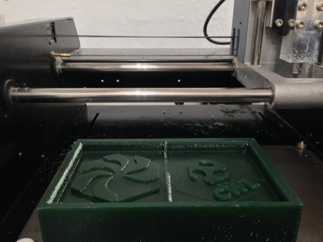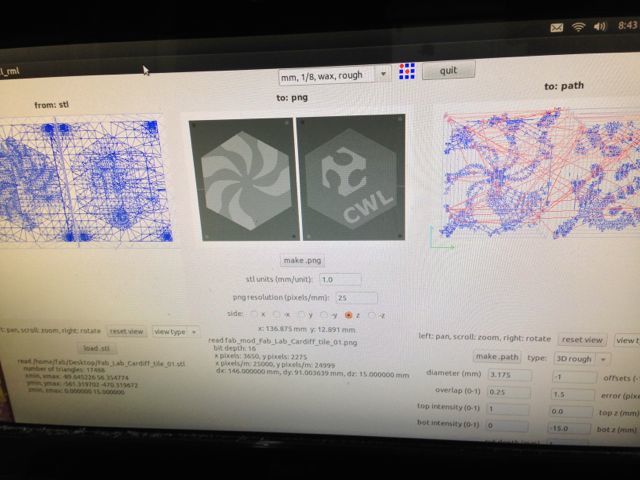 Step 2: milling the wax in Roland Modela - like in pcb milling, only that under the "job menu" I need to choose "wax roughing/finishing". The tool normally used for roughing is the 1/4'' and for finishing the 1/8' or the 1/32 mm. In my case I used the first two.