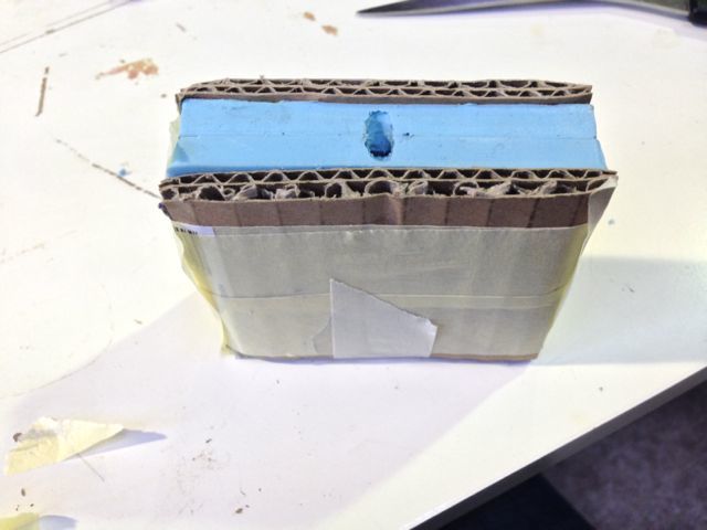 Made sure the rubber mold parts were securely taped. The pouring hole is now well made [despite the problems in milling] and the air pipe is there too. The plastic I used for the end result, is the Smooth Cast 300 from Smooth On. Similarly to the silicon, the mixing techique was the same and quite easy.