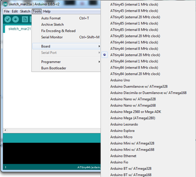 Once configured, all you need to do is pick the ATtiny44a and clock configuration from the optional "boards" in the Arduino tools pull-down menu.