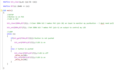 bit_clear(DDRA,BIT(3)); //clear DDRA bit 3 makes PA3 (pin 10) an input to monitor my pushbutton - I don’t need pull-up resistor