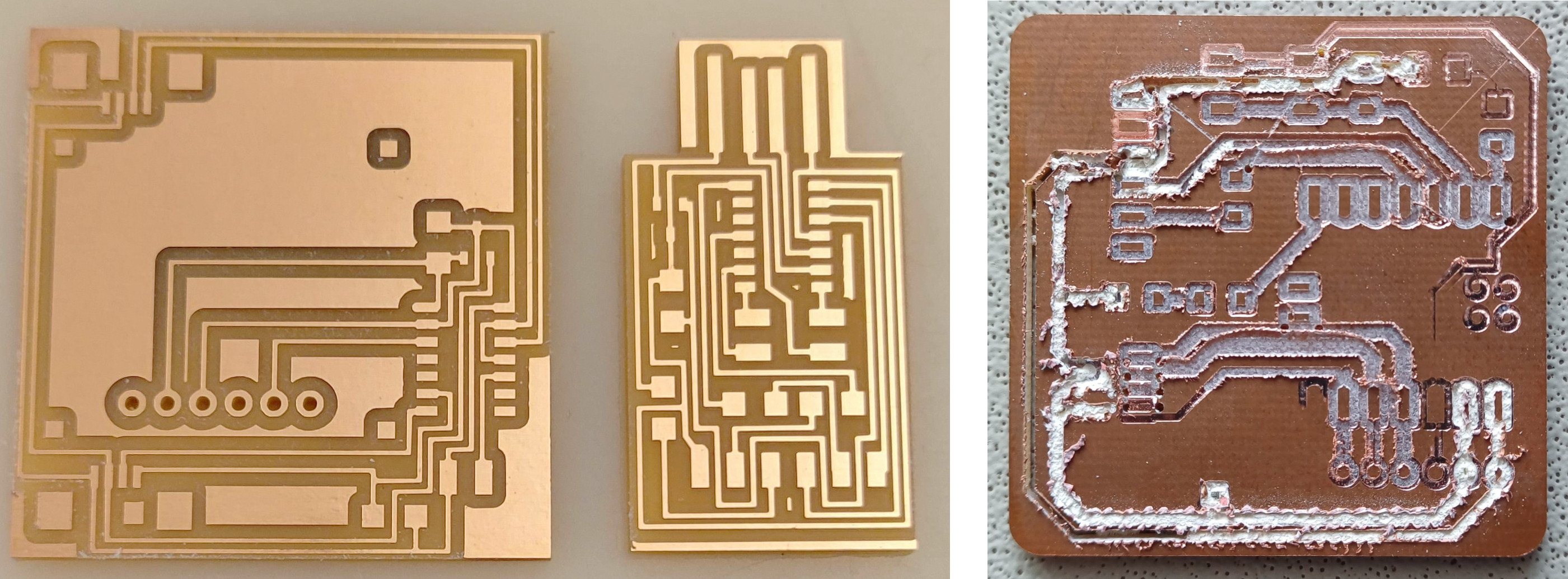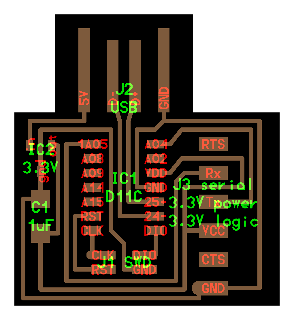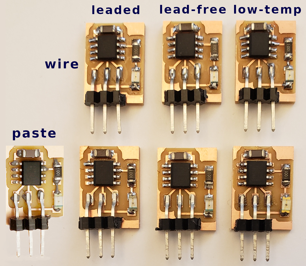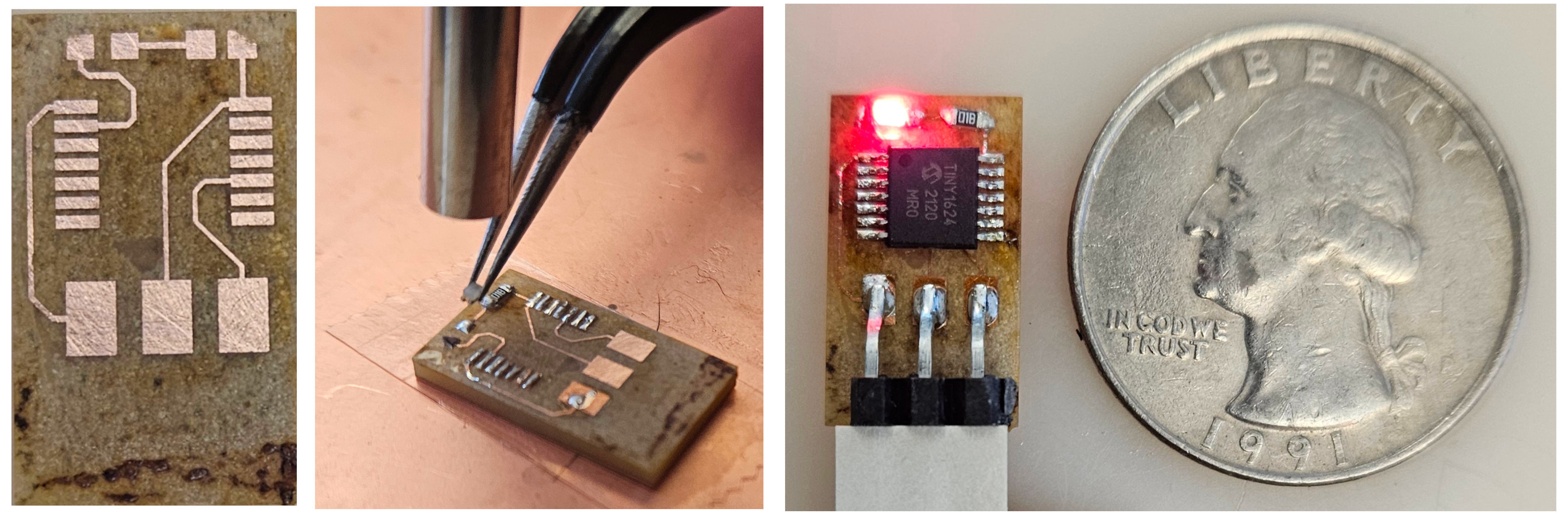 PCB (Printed Circuit Board) fabrication dead bug circuits etching set-up, feature size, batch lithography, transfer, print ferric/cupric chloride, ammonium/sodium persulfate citric acid, peroxide SDS water consumption waste machining finish machines tools 0.010 1/64 1/32 V-bits tapered bits fixturing underlay zeroing mounting lowering probing set-screws, collets lifetime deburring cleaning climb vs conventional nesting registration vinyl cutter flex connections encapsulation milling laser cutter engraver combined LIG printing conducting inks plating sewing PCB materials rigid FR4 (epoxy glass) FR1 (phenolic paper) garolite flex Kapton, Pyralux #1 epoxy film, #1126 copper tape high-frequency teflon glass copper 0.5 oz: 17.5 um 1.0 oz: 35 um 2.0 oz: 70 um board houses JLCPCB, PCBWay, OSH Park, Aisler, PCB, assembly design rules width/spacing (15, 5 mils) layers 1, 1.5, 2, 2+, 4, N mechanical, drill, solder mask, silk screen vias wires, header, rivets, plated, blind, buried components through-hole surface-mount chip-scale breadboards assembly solder iron station fume extractor microscope burns ROHS types lead-free wire paste SDS leaded wire paste SDS low-temp wire paste bismuth eutectic tinning wetting manual, drag, wave cold solder joints, solder bridges, checking joints flux core, paste, pen reflow stencil hot plate, convection oven, IR FR1 vs FR4 hot air wire, paste preheat QFN, MLF, CSP, BGA, ... heat-and-squish, tin-and-heat stuffing component orientation tacking down parts bottom to top, inside to outside headers washing desoldering braid tweezers vacuum hot air gravity cutting traces, adding jumpers placement pick-and-place encapsulation CAM formats Gerber/RS-274X png resolution FlatCAM pcb2gcode gerber2img gerber2png wiki mods tool changer video trace width traces traces+exterior interior 1/64" 0.010" V-bit fiber laser galvo laser pad, trace size debugging inspect, reflow solder joints check component orientation, values verify data sheets confirm connector orientation measure supply voltages probe I/O signals Quentin Isaak Sean group assignment: • characterize the design rules for your in-house PCB production process • submit a PCB design to a board house individual assignment: • make and test an embedded microcontroller system that you designed • extra credit: make it with another process